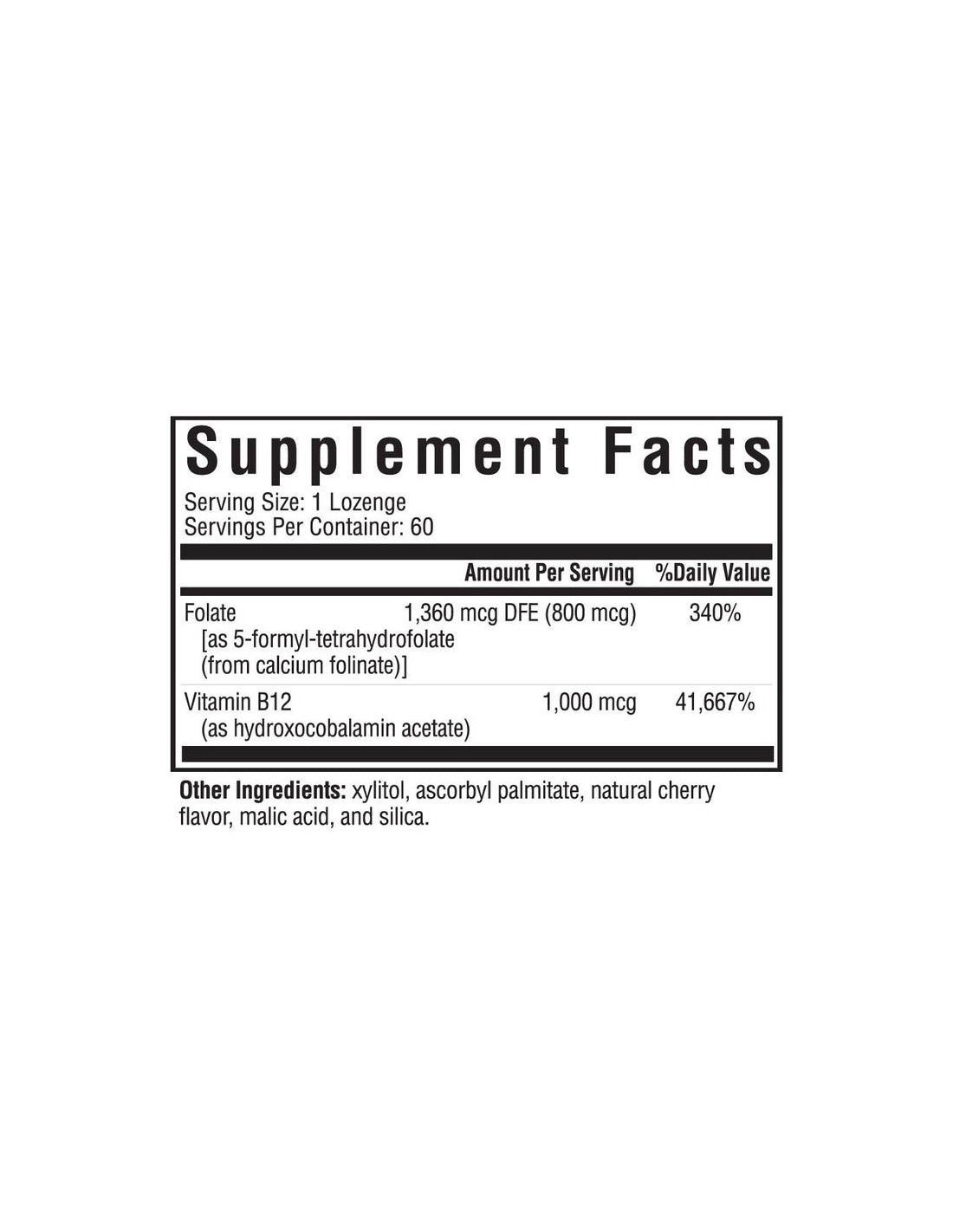 | Folate (as folinic acid, calcium salt) | 1,360 mcg DFE (800 mcg) | 400% |