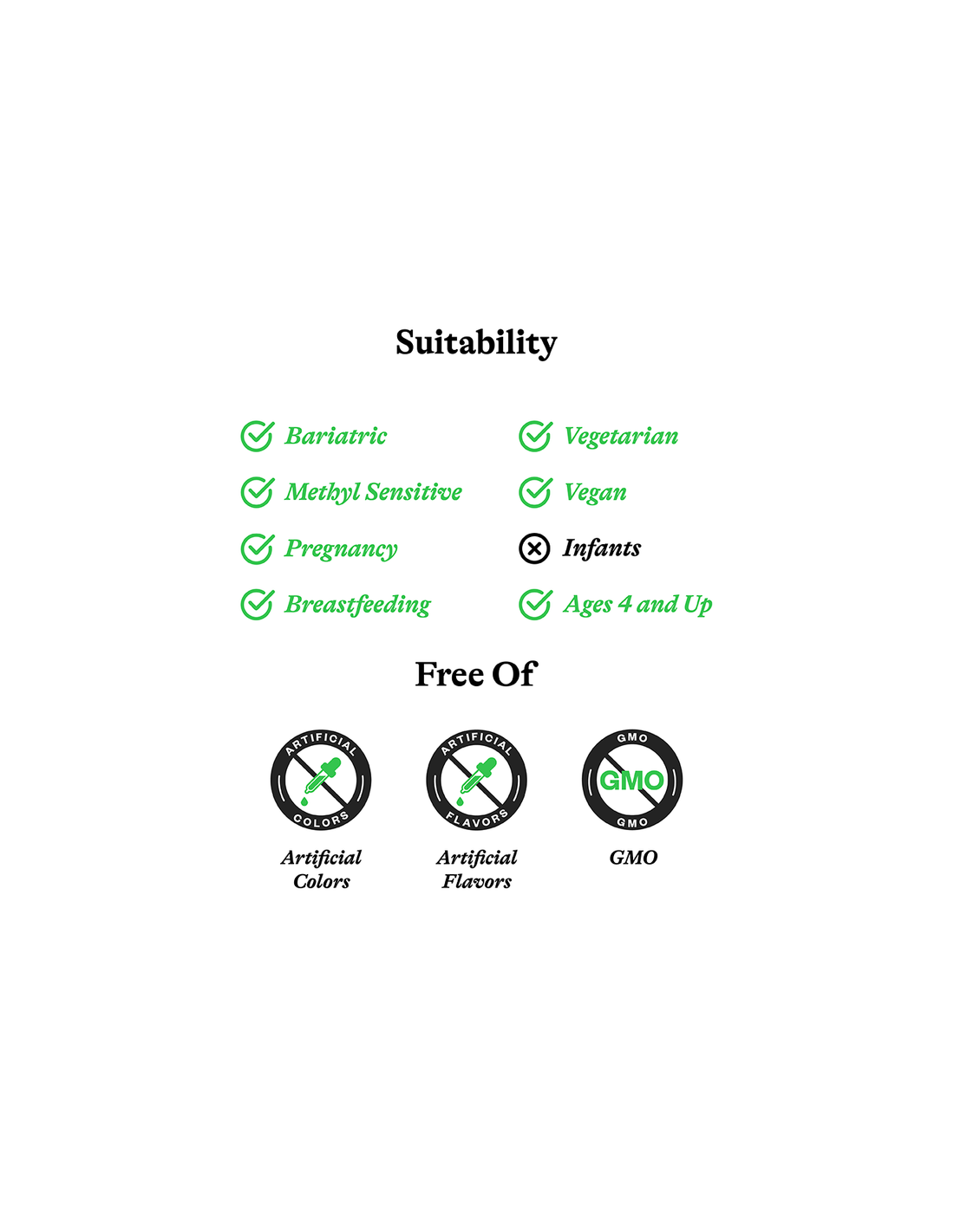Free from dairy, gluten, soy, artificial colors, flavors, preservatives. Suitable for vegetarians and vegans.