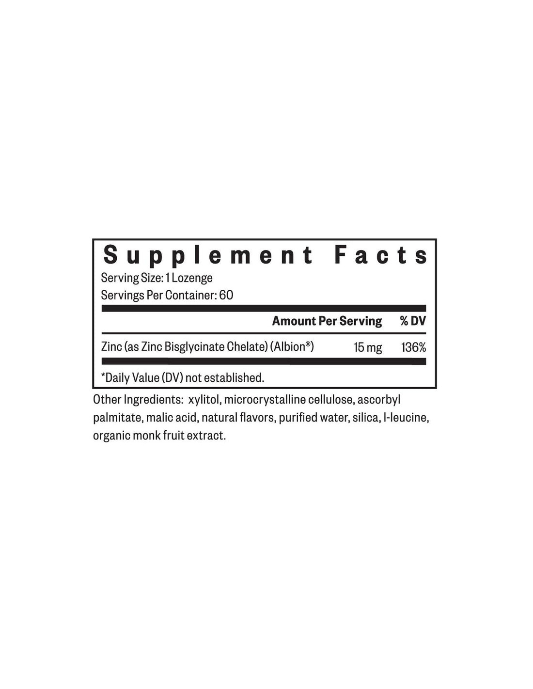 Zinc Lozenge utiliza quelato de bisglicinato de zinc TRAACS ® , una forma de zinc suave y bien tolerada. Cada tableta se puede dividir fácilmente en pedazos más pequeños para un mayor control de la dosis. Estas tabletas usan solo xilitol y sabores naturales, sin edulcorantes ni colorantes artificiales.