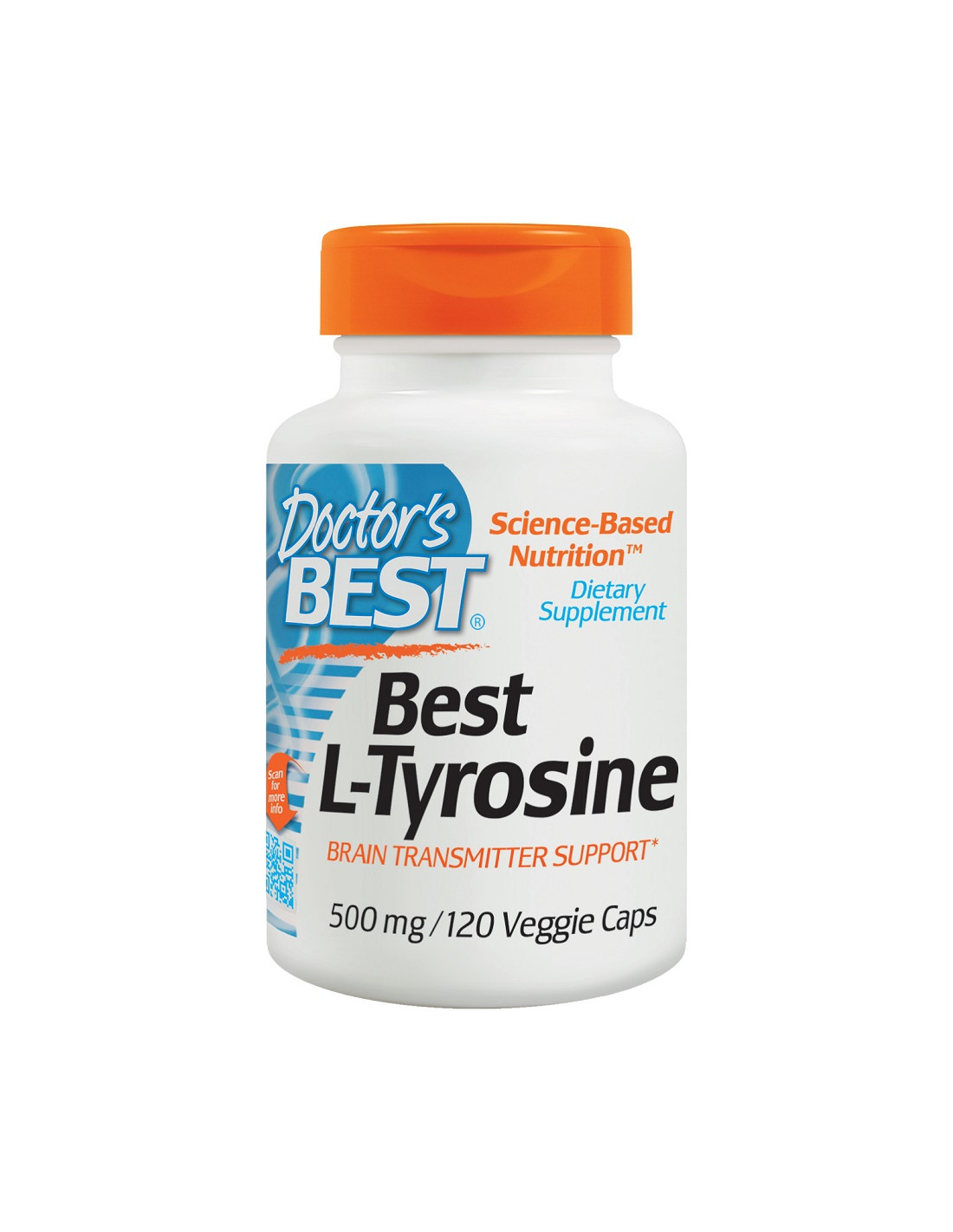 Doctor's Best L-Tirosina aporta 500 mg de L-tirosina por ración. Este suplemento de un solo aminoácido se presenta en cápsulas vegetarianas para un uso diario cómodo.