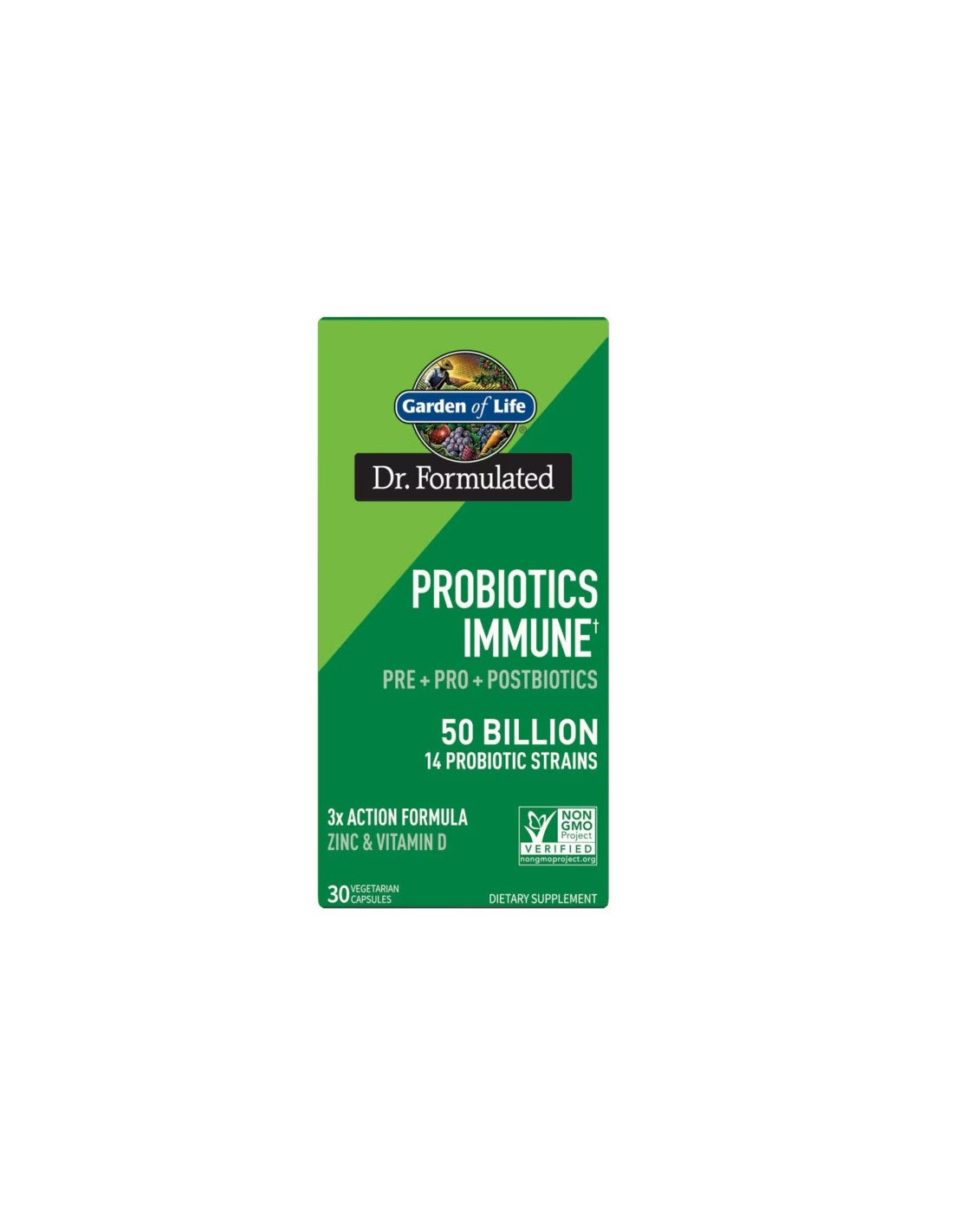 Dr. Formulated Probiotics Immune 50 Billion de Garden of Life es un suplemento alimenticio en cápsulas formulado con vitamina D3, zinc y una mezcla de probióticos multicepa, combinado con fibra prebiótica y metabolitos posbióticos. El producto está destinado para uso diario en adultos.