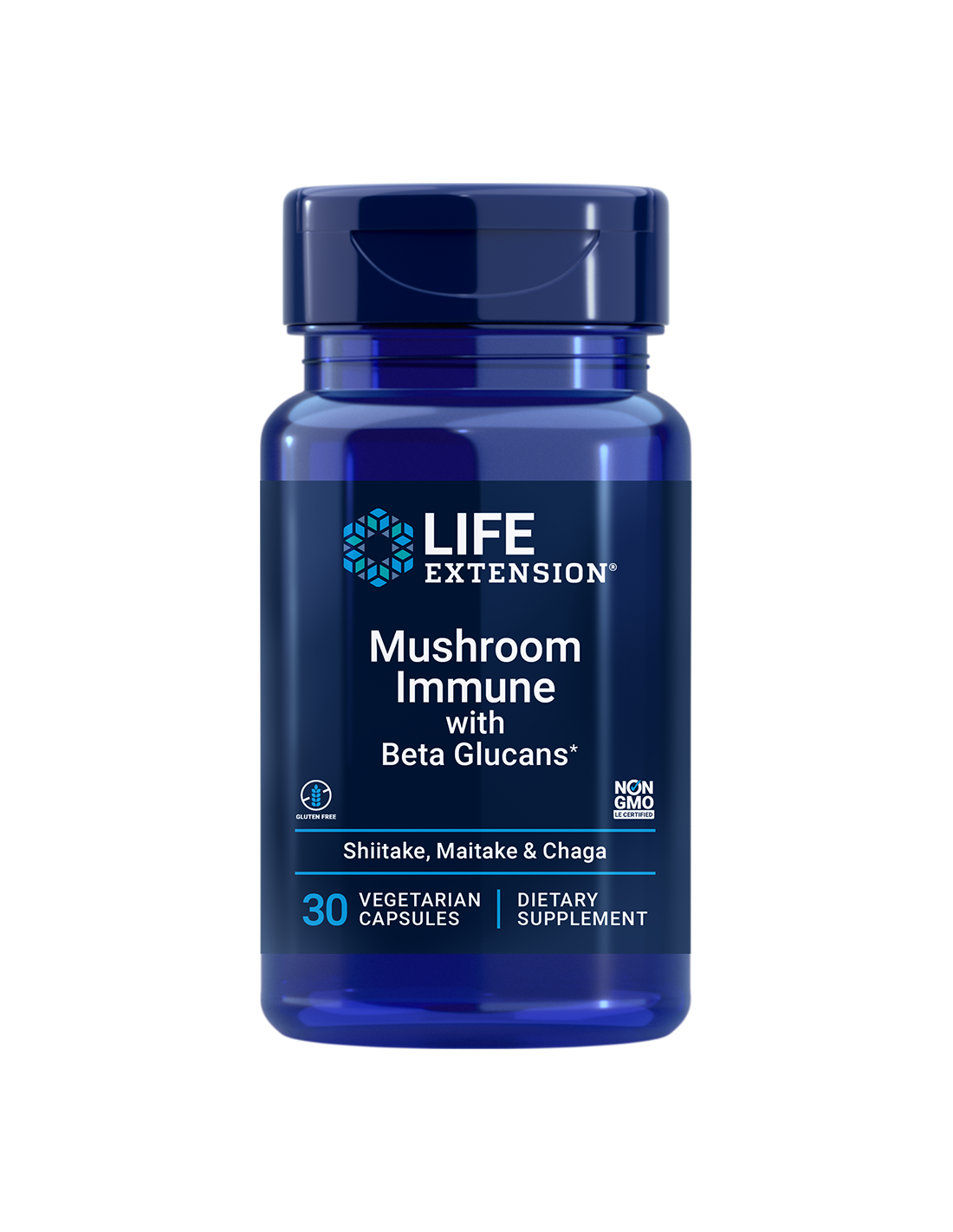 Life Extension® Mushroom Immune con beta glucanos (30 cápsulas vegetarianas) ofrece una mezcla sinérgica de polvos para todo el cuerpo de fructificación de hongos shiitake, maitake y chaga (400 mg), más 250 mg de Wellmune® β-1,3/1,6-glucano de levadura de panadería, formulado para ayudar a mantener una respuesta inmune equilibrada en individuos activos sin hacer afirmaciones de salud no autorizadas.