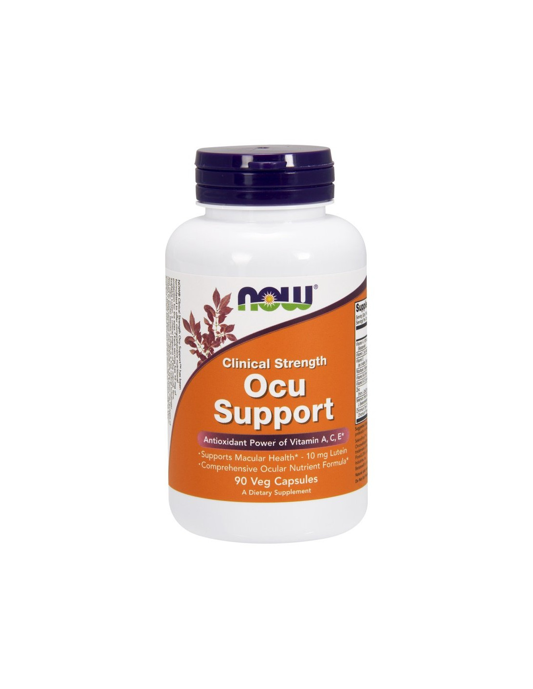 Las cápsulas NOW® Ocu Support Clinical Strength combinan vitaminas esenciales, minerales y extractos vegetales como luteína, zeaxantina, arándano y ginkgo biloba. Cada dosis de tres cápsulas vegetarianas está formulada según la etiqueta oficial.