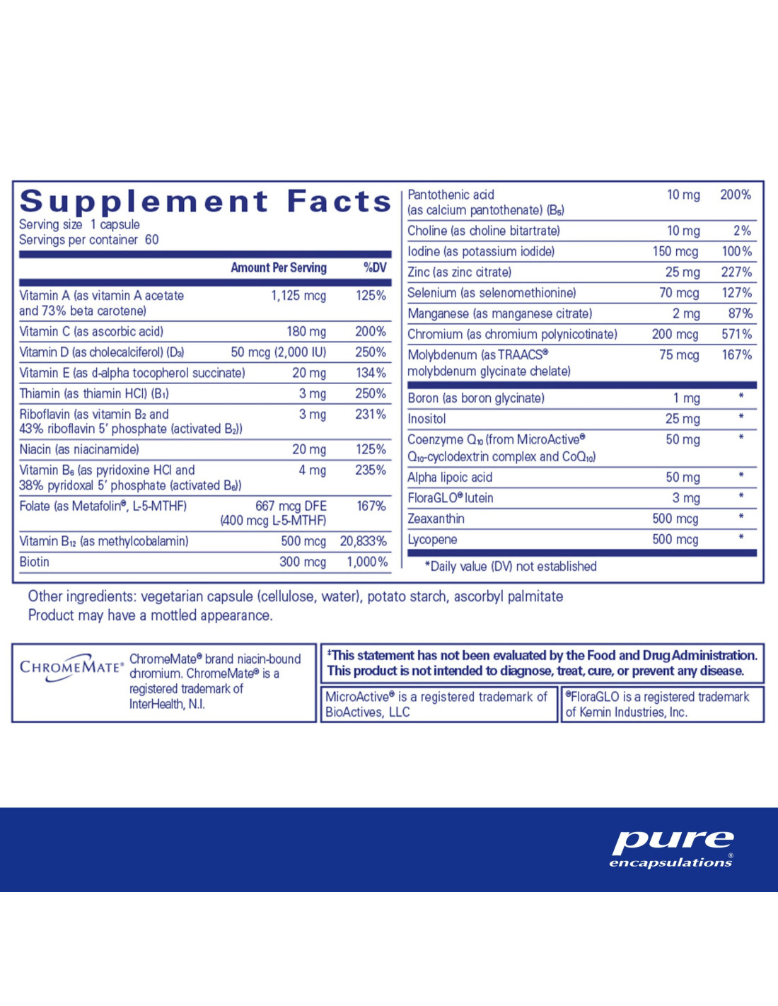 Ubiquinona, complejo de ciclodextrina de ubiquinona MicroActive® Q10, carotenoides que proporcionan luteína, bitartrato de colina, succinato de d-alfa tocoferol, inositol, colecalciferol, niacinamida, betacaroteno, pantotenato de calcio, carotenoides que proporcionan licopeno, selenometionina, carotenoides que proporcionan zeaxantina, palmitato de ascorbilo, menaquinona-7, fitomenadiona, citrato de manganeso, yoduro de potasio, clorhidrato de tiamina, acetato de retinol, fosfato de piridoxal 5', clorhidrato de piridoxina, fosfato de riboflavina 5', riboflavina, picolinato de cromo, metilcobalamina, metilfolato de calcio-l, biotina, molibdato de sodio, ácido ascórbico, bisglicinato ferroso, citrato de zinc, ácido alfa lipoico, cápsula vegetariana (hidroxipropilmetilcelulosa sódica), celulosa)