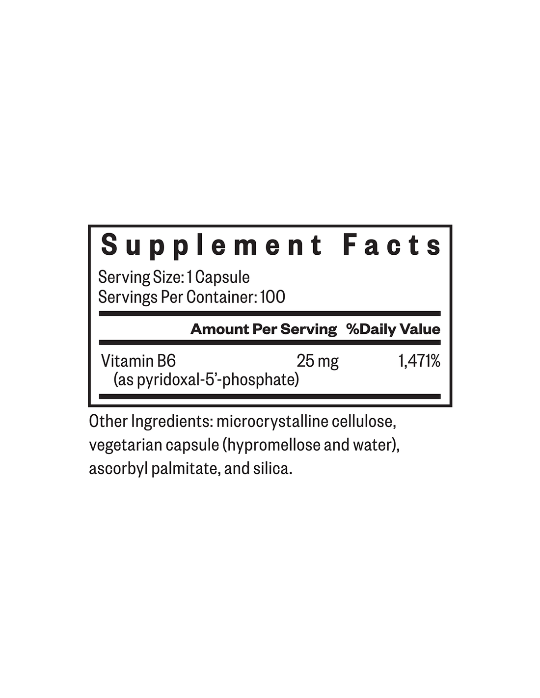 Vitamina B6 (como piridoxal-5'-fosfato), celulosa microcristalina, cápsula vegetal (hipromelosa y agua), palmitato de ascorbilo, sílice. Sin gluten, lácteos, soja, OMG, colorantes ni conservantes artificiales. :contentReference[oaicite:3]{index=3}