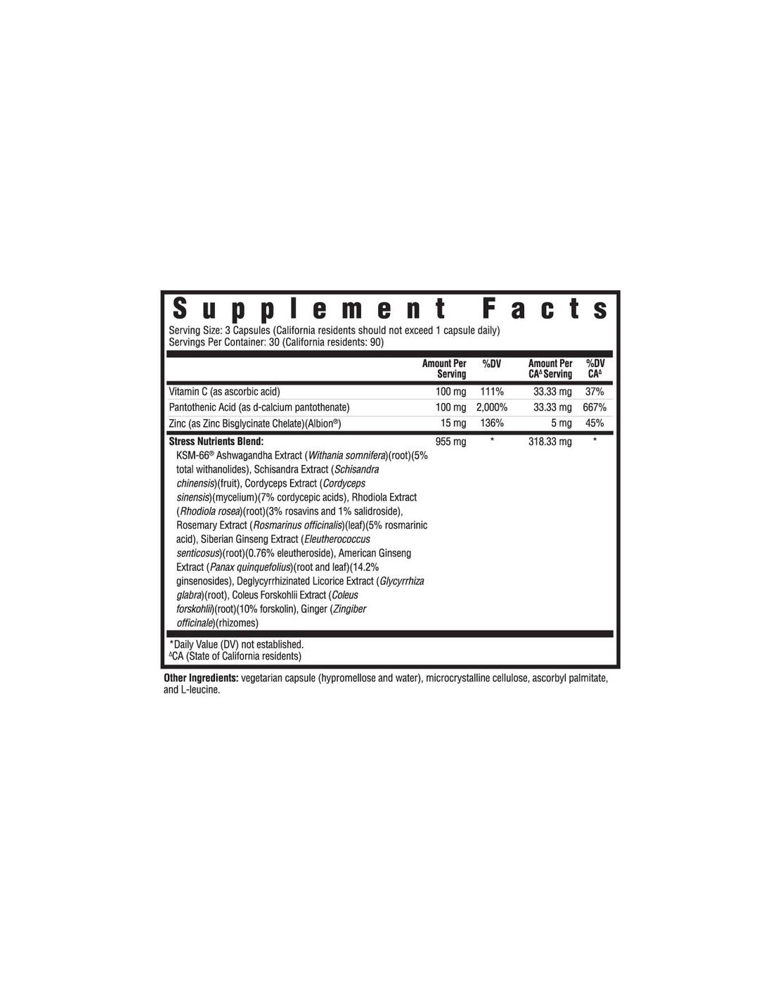 La fórmula incluye extracto de raíz de ashwagandha KSM-66®, rodiola, regaliz, romero y extractos de ginseng siberiano y americano, junto con vitamina C, ácido pantoténico y zinc, que contribuyen a las funciones fisiológicas normales dentro de una dieta variada.