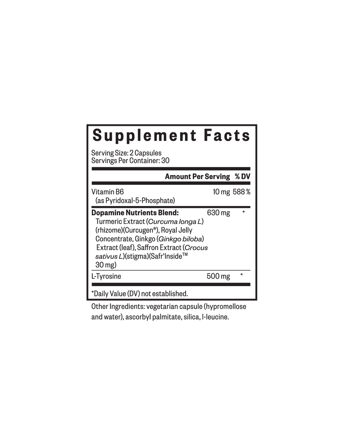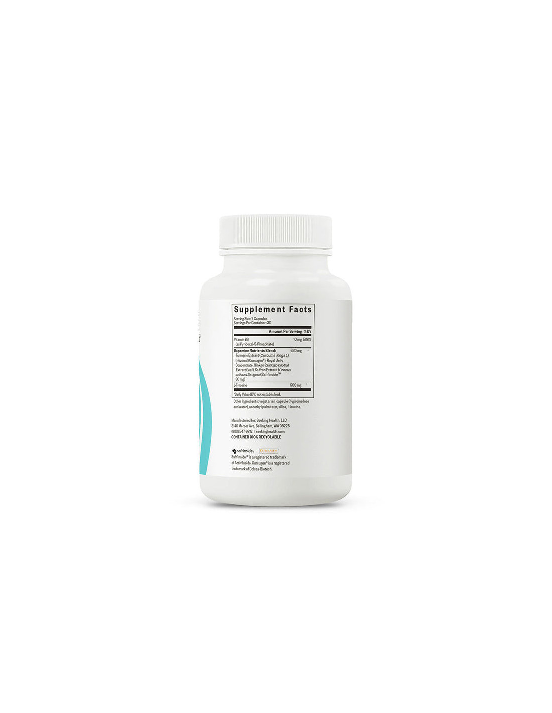 Nutrientes Dopaminérgicos – 60 Cápsulas | Seeking Health es un suplemento nutricional especializado que combina 10 mg de vitamina B6 activada (como piridoxal-5-fosfato) con L-tirosina y un complejo botánico sinérgico. Esta mezcla contiene extracto estandarizado de cúrcuma (Curcugen®), extracto de hoja de ginkgo, extracto de estigma de azafrán (Safr'Inside™) y concentrado de jalea real. Diseñada en cápsulas vegetarianas hipoalergénicas, esta fórmula puede ser adecuada para quienes buscan un apoyo equilibrado con ingredientes vegetales biodisponibles.