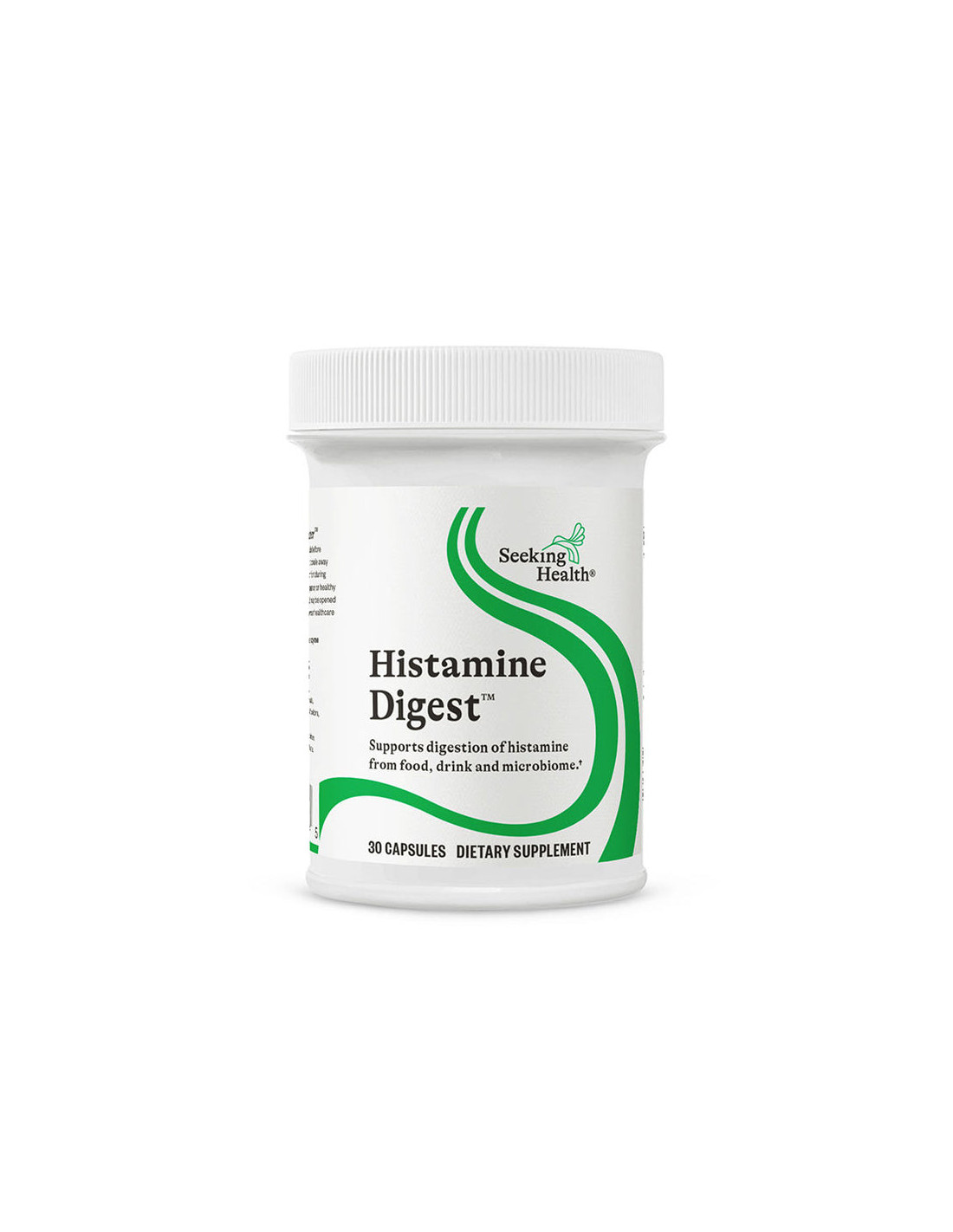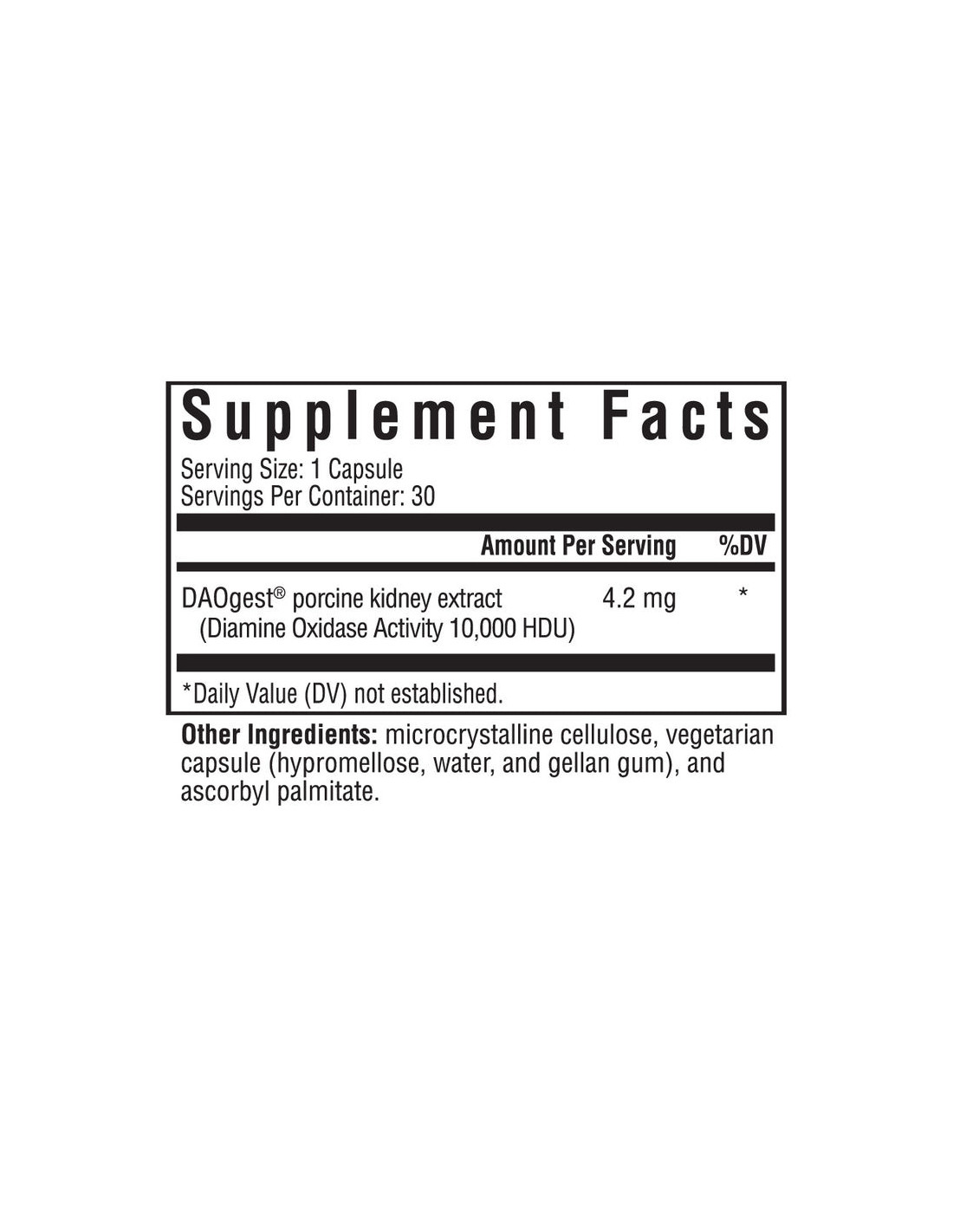 Histamine Digest – 30 Cápsulas contiene DAOgest®, un extracto de riñón porcino de alta calidad que ofrece 30,000 HDU de actividad de diaminooxidasa (DAO) por cápsula. La DAO es la principal enzima implicada en la descomposición de la histamina alimentaria. Esta fórmula hipoalergénica está diseñada para ayudar a las personas con sensibilidad a la histamina a controlar su ingesta alimentaria.