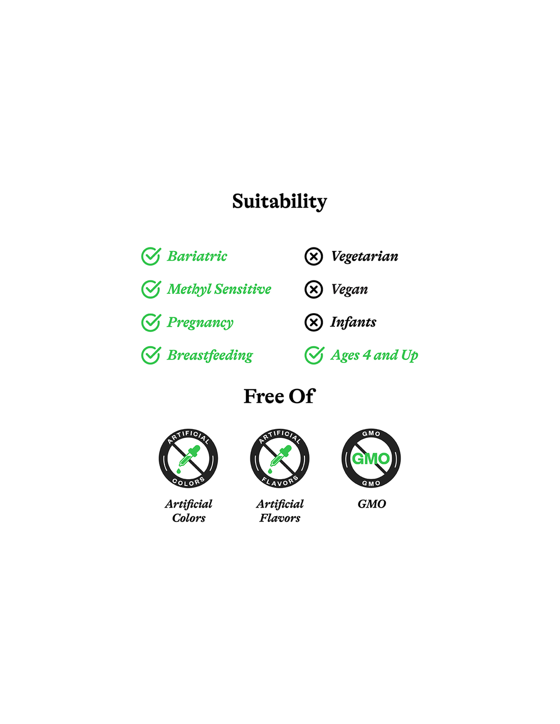 Libre de gluten, lácteos, soja, OGM, conservantes, colorantes artificiales y alérgenos comunes.