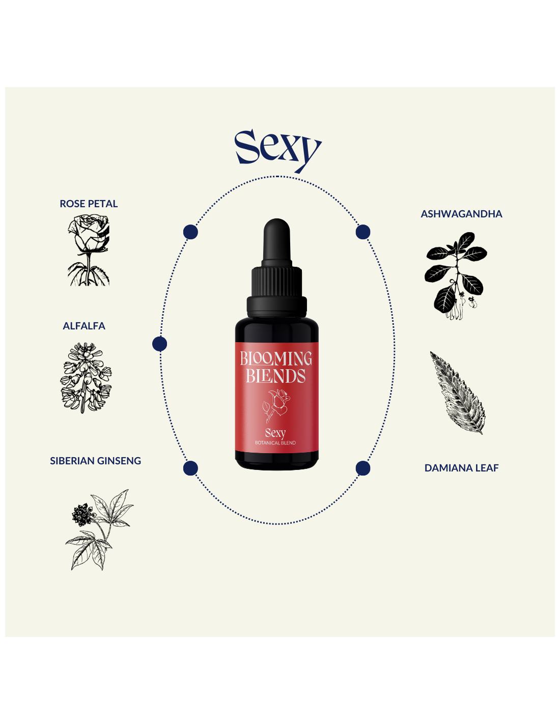 Glycérine végétale (sève de colza), pétale de rose (Rosa), luzerne (Medicago Sativa), racine d'Ashwagandha (Withania Somnifera), ginseng de Sibérie (Eleutherococcus Senticosus), feuille de Damiana (Turnera Diffusa)