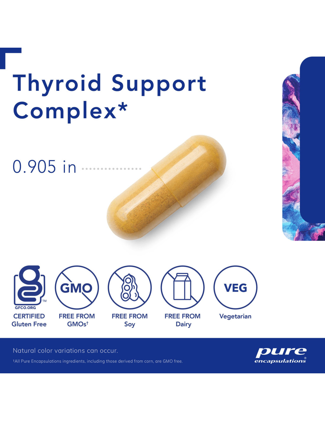 Tous les produits Pure Encapsulations sont exempts de : blé et gluten, œufs, arachides, gras trans et huiles hydrogénées, OGM, stéarate de magnésium, dioxyde de titane, carraghénane, revêtements et gommes laques, colorants, arômes et édulcorants artificiels, liants, charges et conservateurs inutiles.