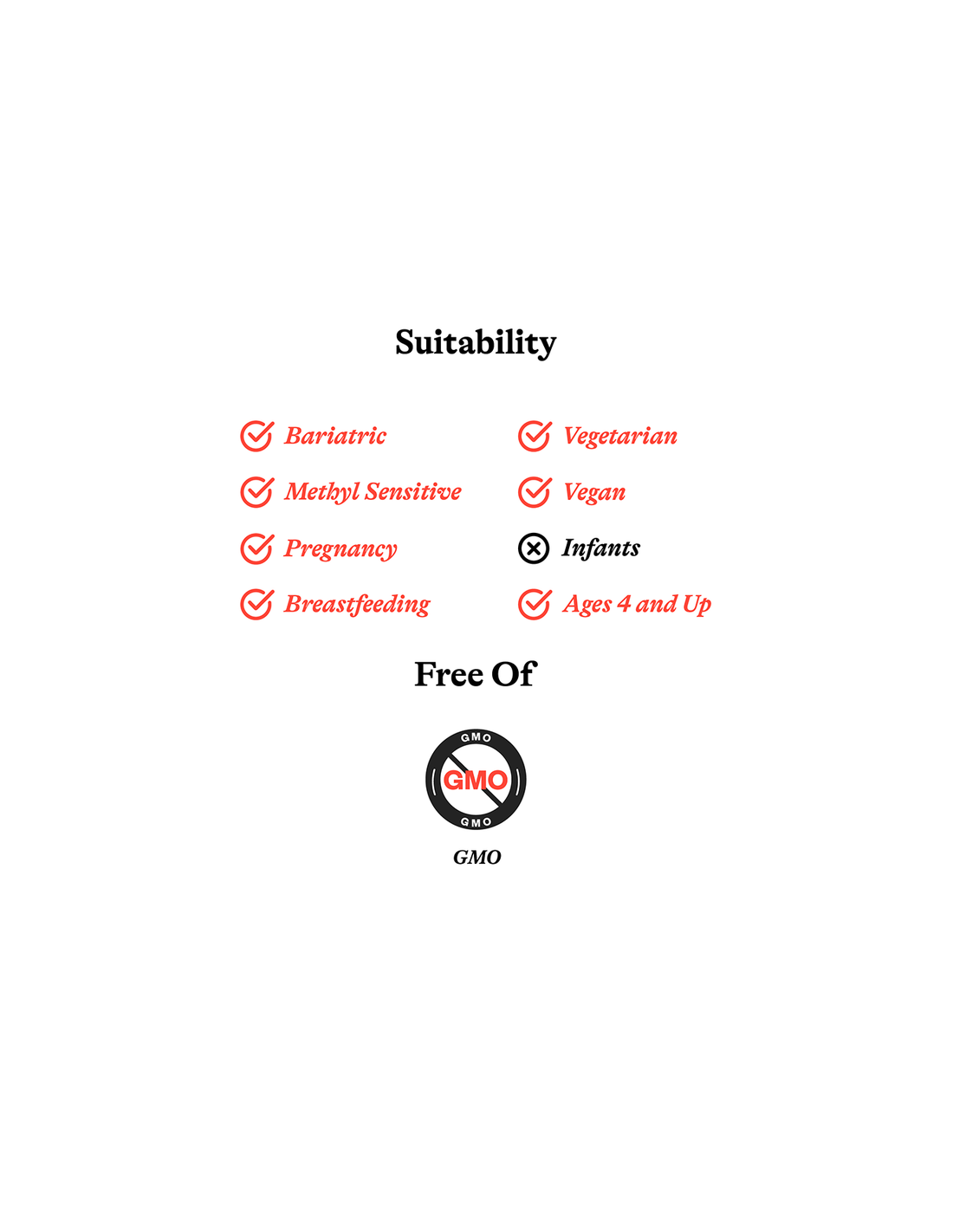 Folate (sous forme d'acide folinique, sel de calcium), xylitol, palmitate d'ascorbyle, arômes naturels, silice. Sans gluten, sans produits laitiers, sans soja, sans colorants ni conservateurs artificiels.
