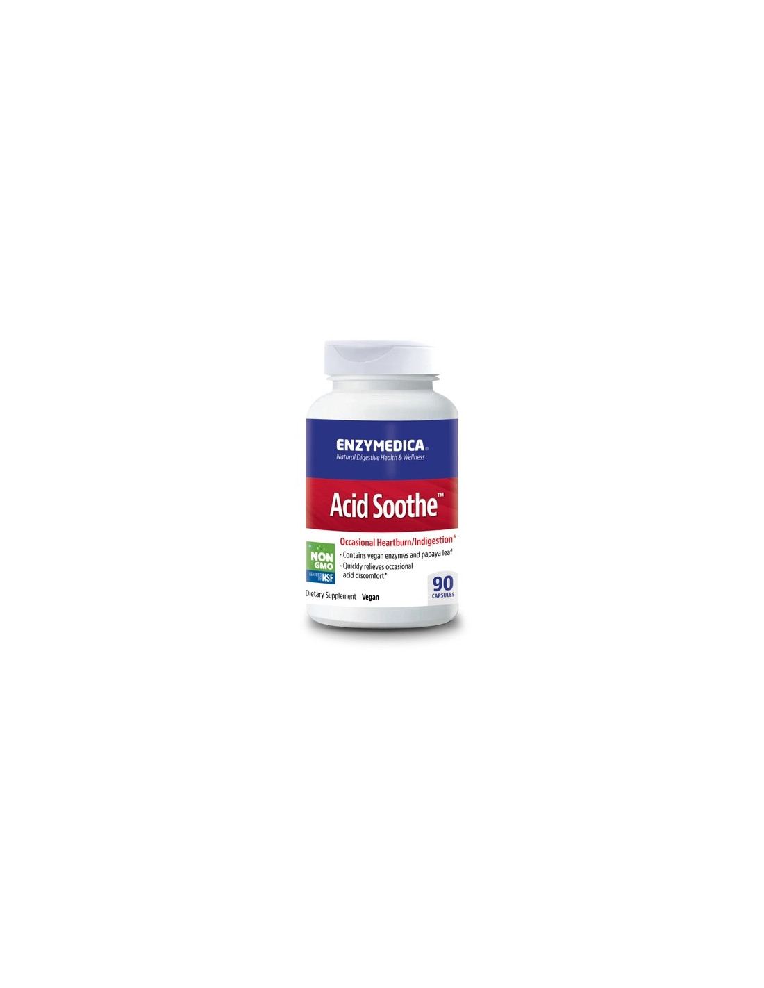 Az Enzymedica Acid Soothe® terméke cink-karnozint, gyógynövénykivonatokat és emésztőenzimeket tartalmaz vegetáriánus kapszulákban, mesterséges adalékanyagok nélkül.