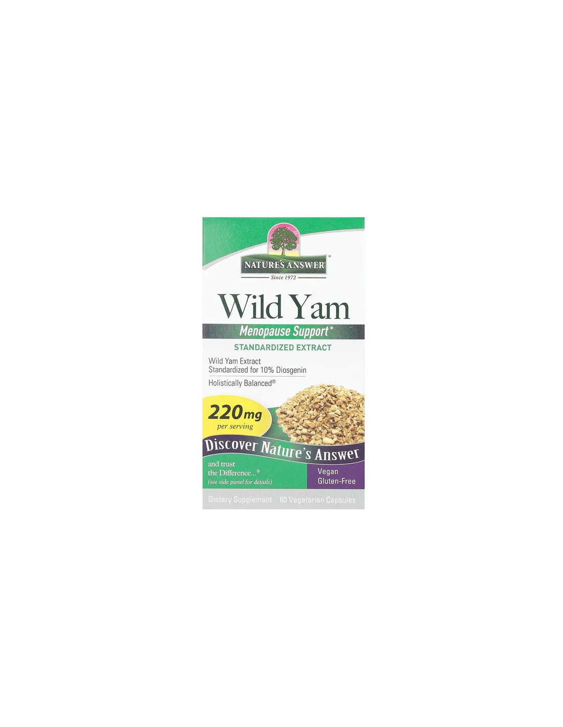 A Nature's Answer Wild Yam a standardizált vad jamsz (Dioscorea villosa) gyökér- és rizómakivonatot további teljes értékű gyógynövényekkel ötvözi, így egy egyszerű kapszulaformátumot biztosít, amely alkalmas a napi kiegészítésre.