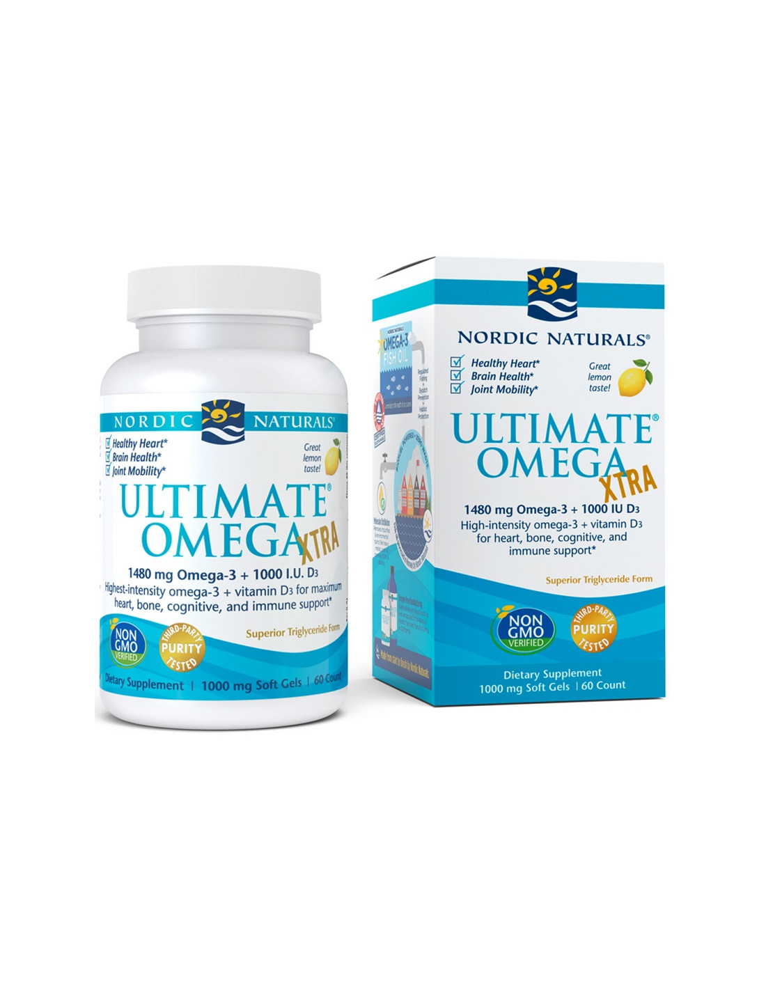 A Nordic Naturals Ultimate Omega Xtra kiváló minőségű omega-3 zsírsavak és D3-vitamin hatékony kombinációját biztosítja. Minden adag (2 lágyzselatin kapszula) összesen 1480 mg omega-3-at tartalmaz, beleértve 850 mg EPA-t és 425 mg DHA-t, valamint 25 µg (1000 NE) D3-vitamint (kolekalciferol). Triglicerid formában készül a fokozott biohasznosulás és tisztaság érdekében.