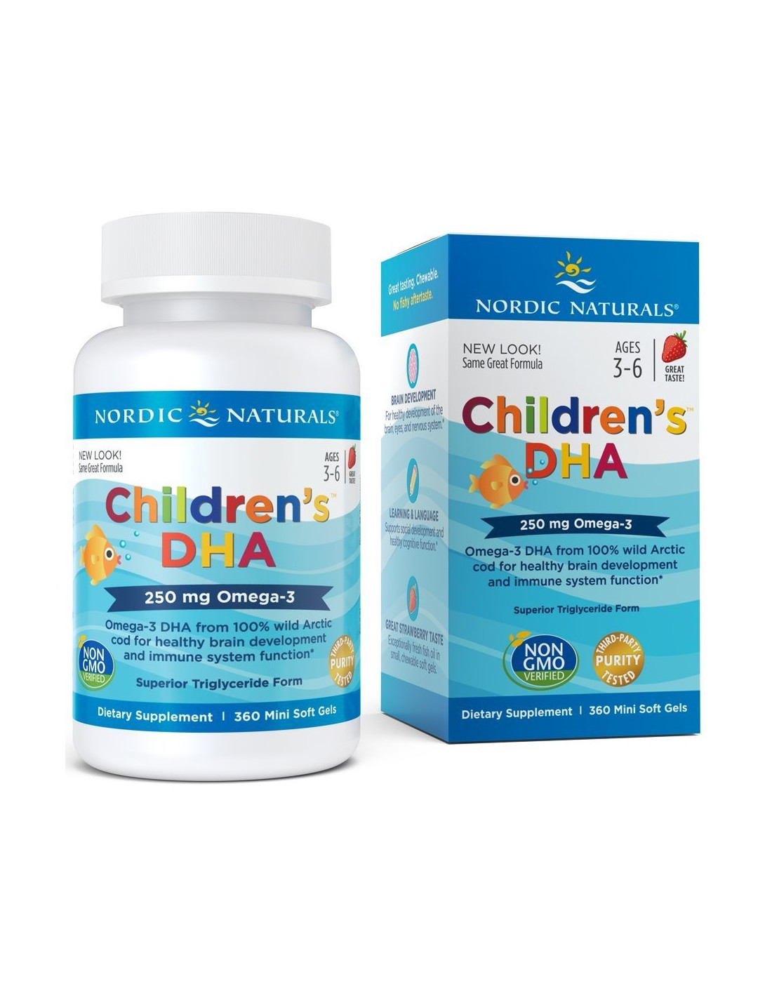 A Nordic Naturals Gyermekeknek szánt DHA 4 lágyzselatin kapszulánként 250 mg összes omega-3 zsírsavat tartalmaz, beleértve 120 mg DHA-t és 80 mg EPA-t. Kizárólag 100%-os sarkvidéki tőkehalmájolajból készült készítmény, amely az esszenciális zsírsavakat természetes triglicerid (rTG) formájában biztosítja az optimális felszívódás és tisztaság érdekében. Minden egyes tételt harmadik fél tesztel frissesség és szennyeződések szempontjából.