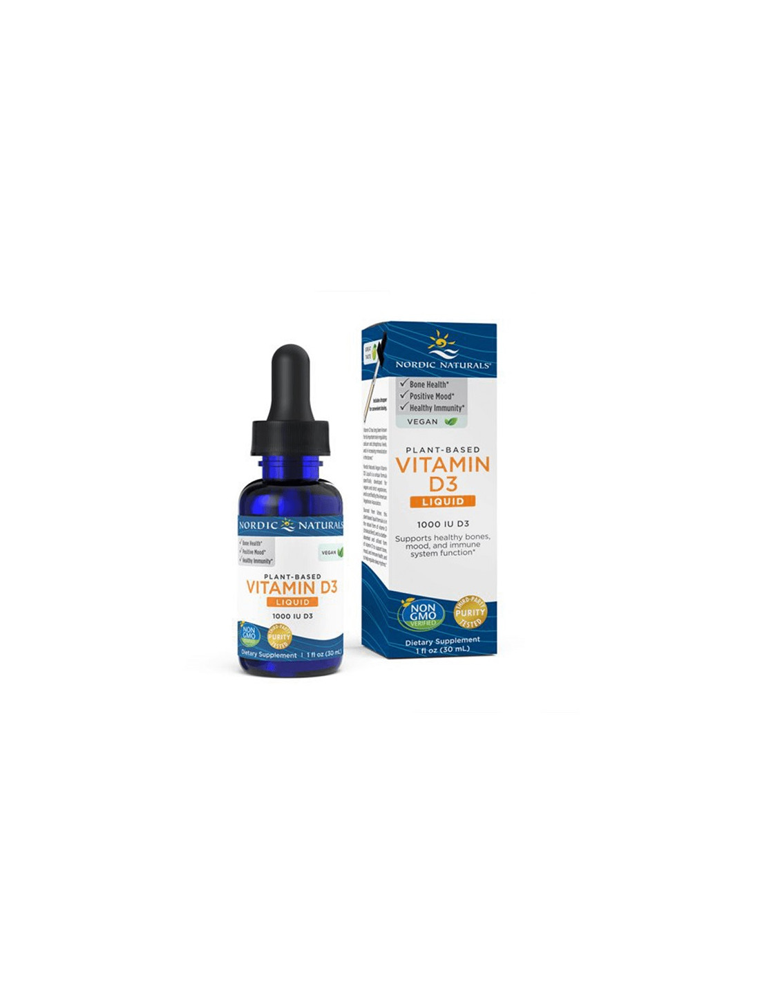 A Nordic Naturals növényi alapú D3-vitamin folyadék 0,5 ml-es adagonként 25 µg (1000 NE) vegán D3-vitamint tartalmaz. A D3-at (kolekalciferol) fenntartható forrásból származó zuzmóból nyerik, és az optimális stabilitás érdekében kókuszdióból származó organikus közepes szénláncú triglicerid (MCT) olajban szuszpendálják. Mesterséges színezékektől, aromáktól és tejtermékektől mentes.