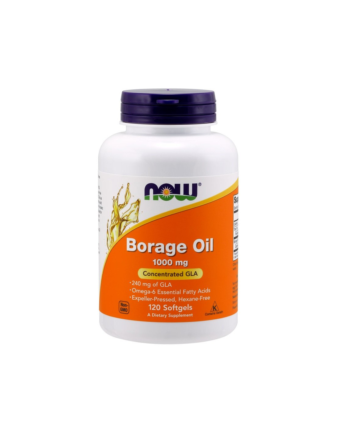 A NOW® Borágóolaj lágyzselatin kapszulánként 1000 mg borágómag-olajat tartalmaz, ami 240 mg gamma-linolénsavat (GLA) biztosít. Az olajat hidegen sajtolják a Borago officinalis magokból, és marhazselatin lágyzselatin kapszulákba kapszulázzák.