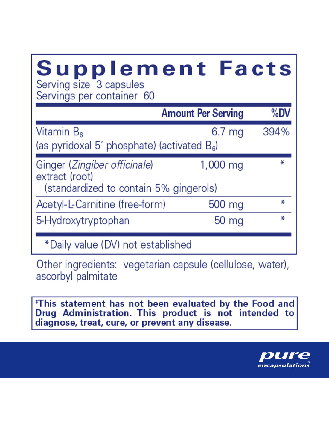 Gyömbérgyökér kivonat, acetil-l-karnitin, 5-hidroxi-triptofán, aszkorbil-palmitát, piridoxál 5'-foszfát. Vegetáriánus kapszula (hidroxipropil-metil-cellulóz).