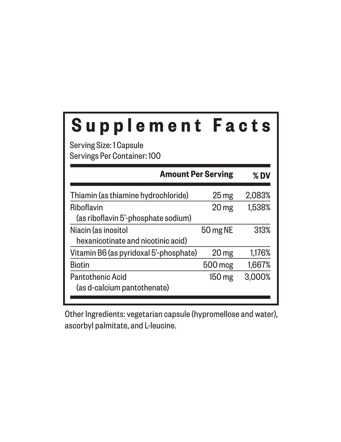Tiamin-hidroklorid, riboflavin-5′-foszfát-nátrium, inozitol-hexanikotinát, niacin, piridoxál-5′-foszfát, biotin, D-kalcium-pantotenát, vegetáriánus kapszula (hipromellóz, víz), aszkorbil-palmitát, L-leucin, mikrokristályos cellulóz. B12-vitamin- és folsavmentes. Nem tartalmaz glutént, tejterméket, szóját, GMO-kat és mesterséges adalékanyagokat.