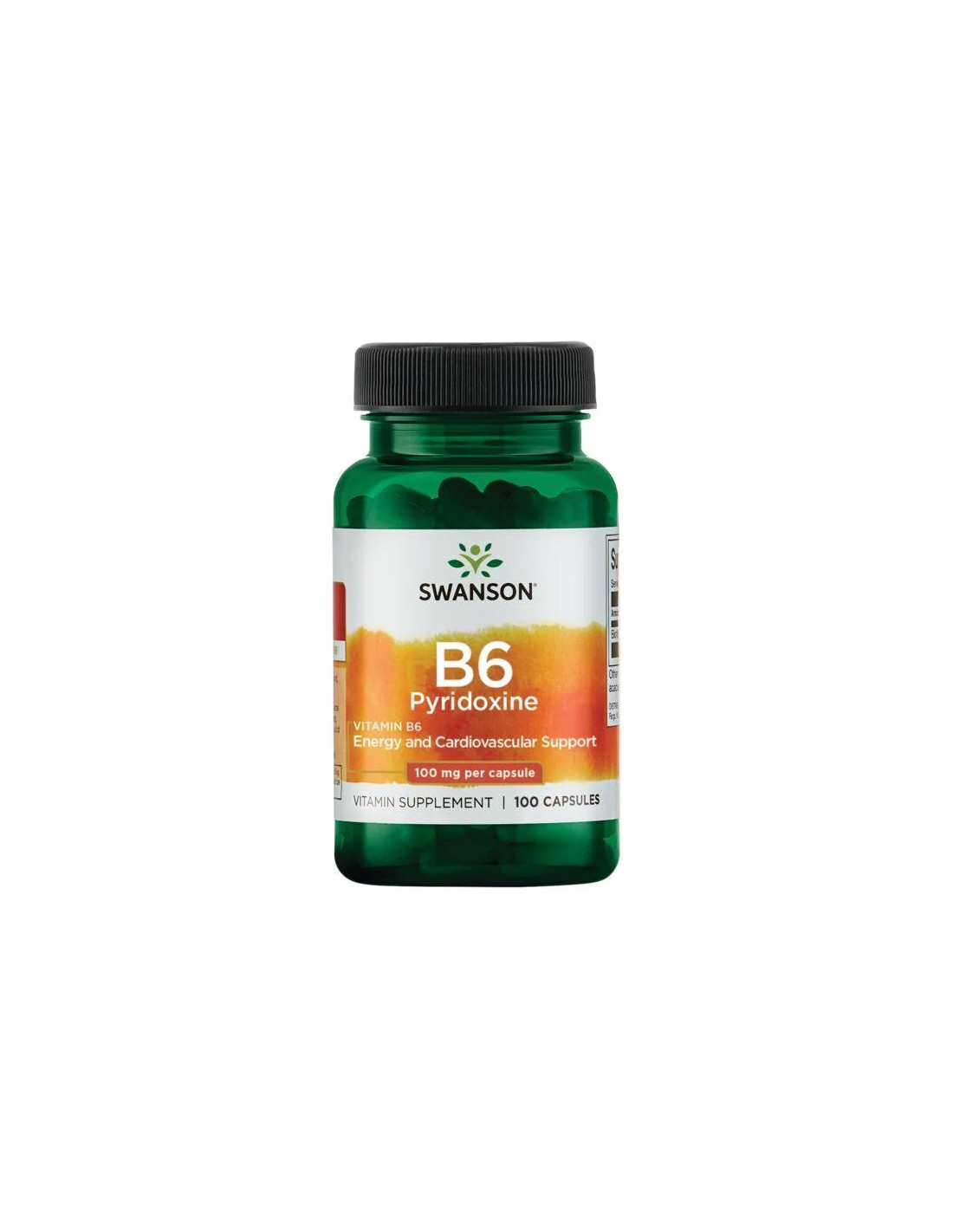 A Swanson B6-vitaminnak számos jótékony hatása van a szervezetben. Egyrészt támogatja a szénhidrátok, fehérjék és zsírok normál lebontását, alapvető szerepet játszik az energia-anyagcserében. Folsavval és B12-vitaminnal is együttműködik a szív- és érrendszer egészségének elősegítése érdekében. Minden kapszula 100 mg B6-vitamint tartalmaz.