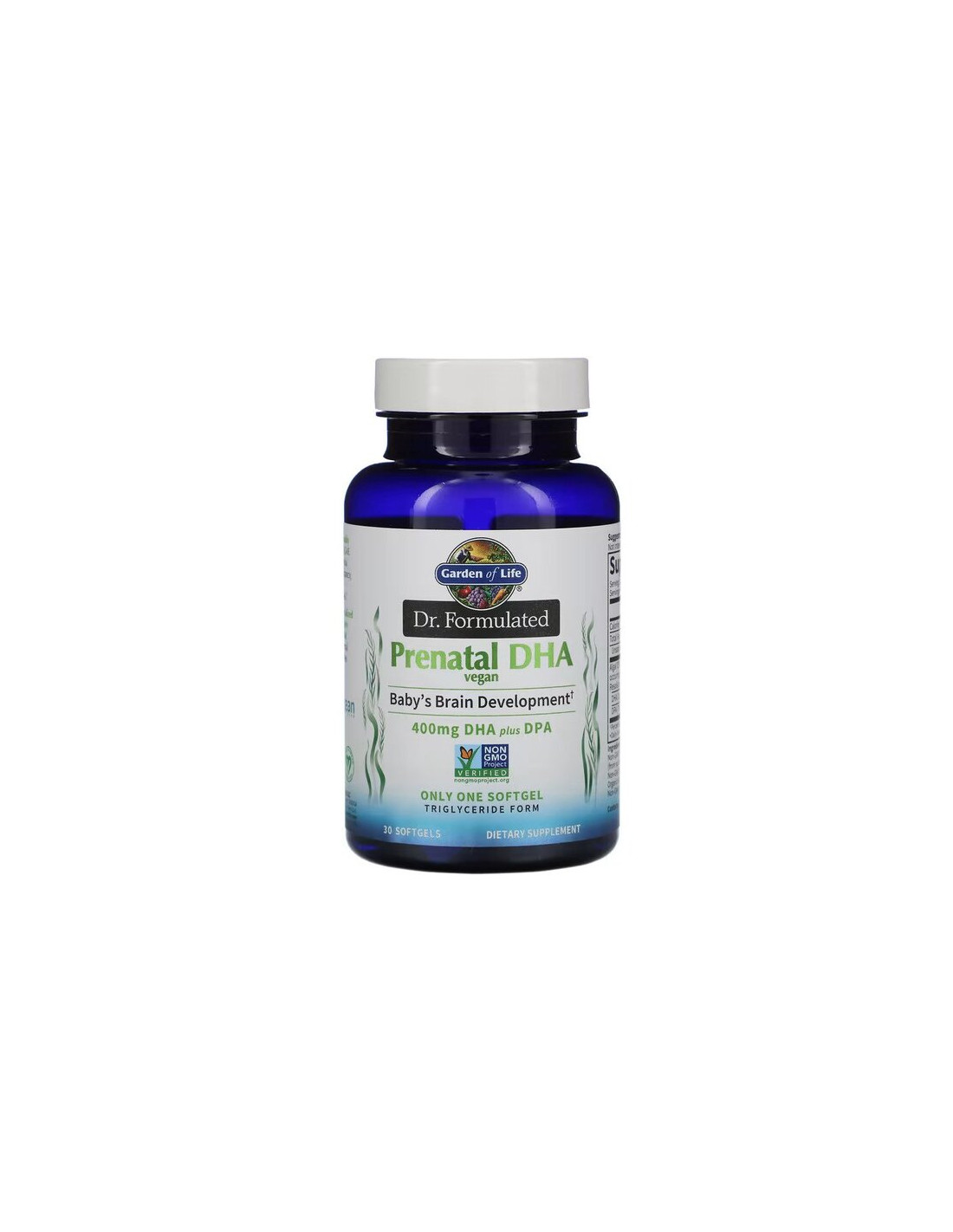 Le capsule molli vegane Dr. Formulated Prenatal DHA di Garden of Life sono un integratore alimentare in capsule molli formulato con olio di alghe sotto forma di trigliceridi, che fornisce acidi grassi omega-3 di origine vegetale. Il prodotto contiene componenti lipidici naturali ed è progettato per l'uso quotidiano da parte degli adulti.