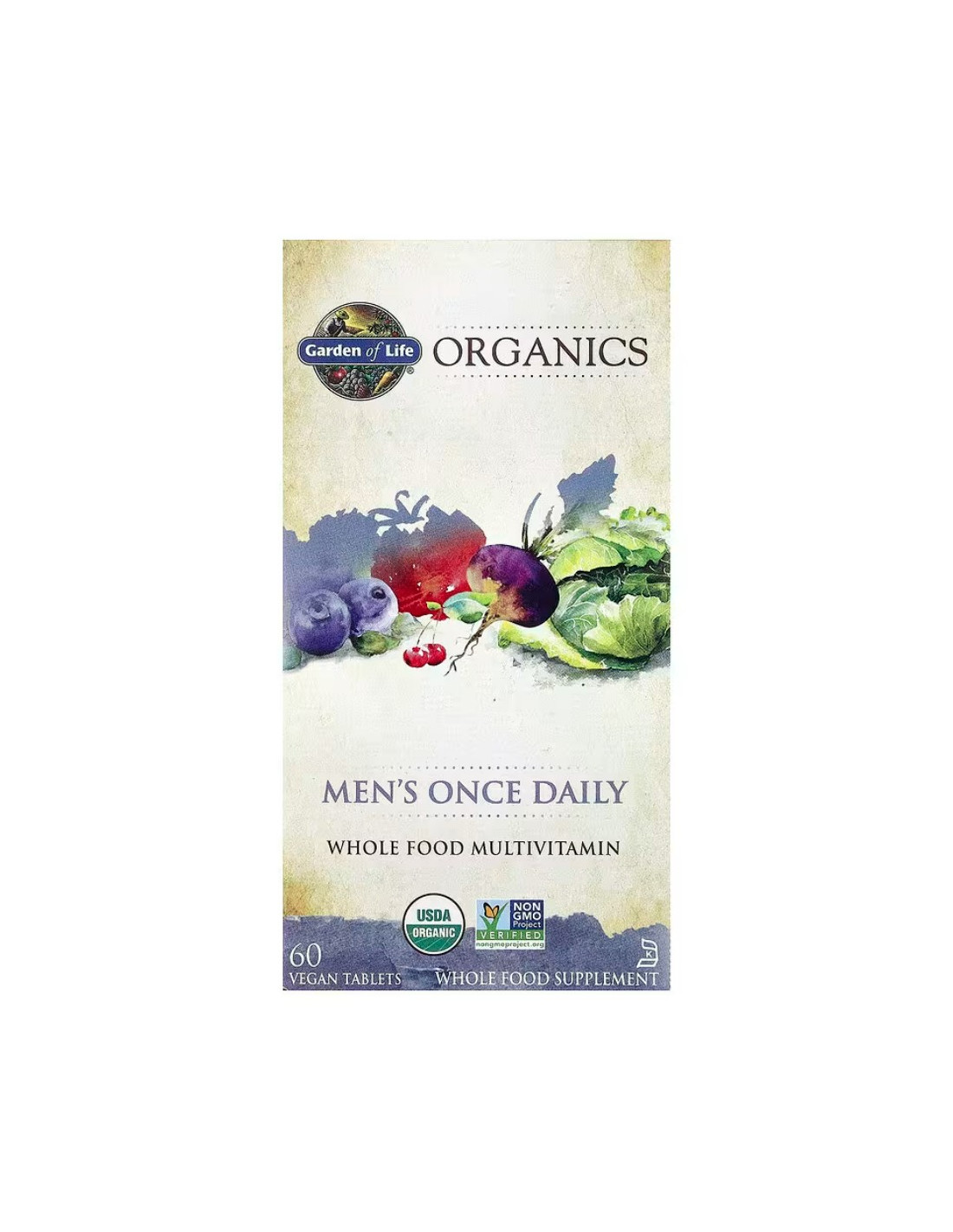 Garden of Life Organics Men's Once Daily è un integratore alimentare formulato con vitamine e minerali provenienti da frutta e verdura biologiche certificate. La formula è studiata per un pratico utilizzo una volta al giorno e integra la dieta quotidiana degli uomini adulti.