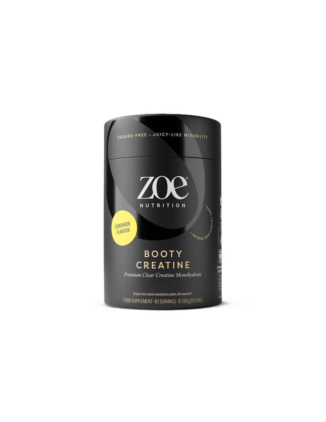 Booty Creatine Lemonade 250 g — Una polvere rinfrescante di creatina monoidrato, studiata per essere facilmente disciolta in acqua. Fornisce 3 g di creatina per porzione, ideale per uno stile di vita attivo. Prodotto in Irlanda per Zoe Fashion Ltd.
