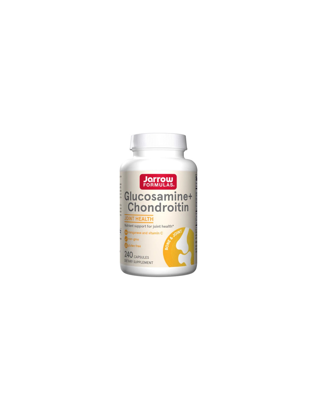 Jarrow Formulas® Glucosamina + Condroitina contiene glucosamina solfato stabilizzata con cloruro di potassio (KCl). Glucosamina e condroitina solfato sono componenti essenziali del tessuto articolare, coinvolti nella produzione di acido ialuronico. Vitamina C e manganese supportano la sintesi di collagene e cartilagine.