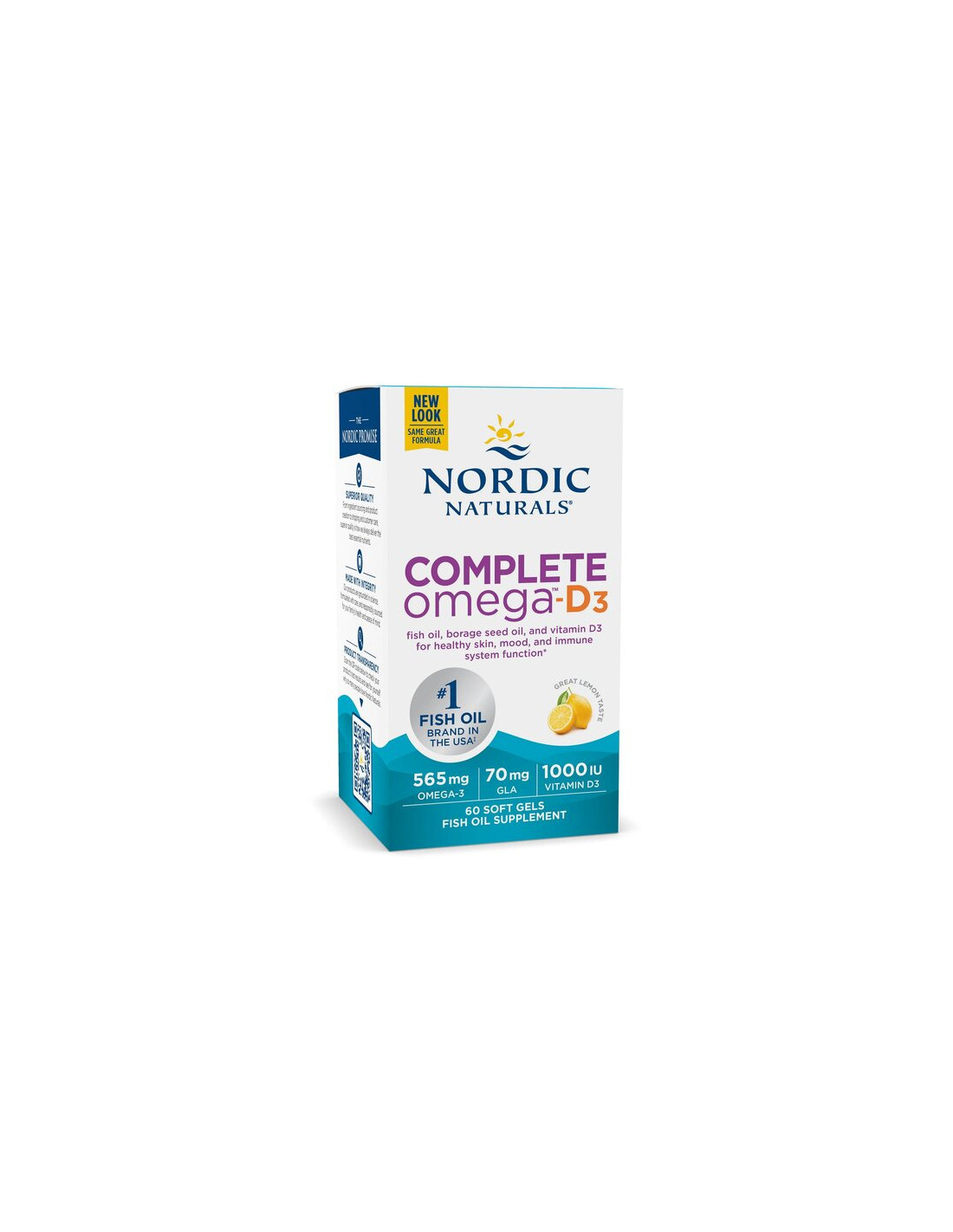 Nordic Naturals Ultimate Omega D3 combina olio di pesce omega-3 di alta qualità con vitamina D3 naturale (colecalciferolo). Ogni porzione (2 capsule molli) apporta 1280 mg di omega-3 totali, inclusi 650 mg di EPA e 450 mg di DHA, più 25 µg (1000 UI) di vitamina D3. Questa formula supporta l'assunzione giornaliera di omega-3 ed è realizzata con pesce di profondità di provenienza sostenibile sotto forma di trigliceridi per un assorbimento e una freschezza superiori.