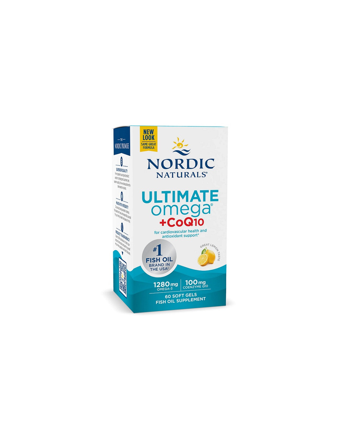 Nordic Naturals Ultimate Omega CoQ10 fornisce una miscela di alta qualità di acidi grassi omega-3 e coenzima Q10. Ogni porzione da due capsule molli fornisce 1.280 mg di omega-3 totali (650 mg di EPA e 450 mg di DHA) e 100 mg di CoQ10 in forma di trigliceridi naturali (rTG), offrendo una comoda combinazione per l'integrazione quotidiana.