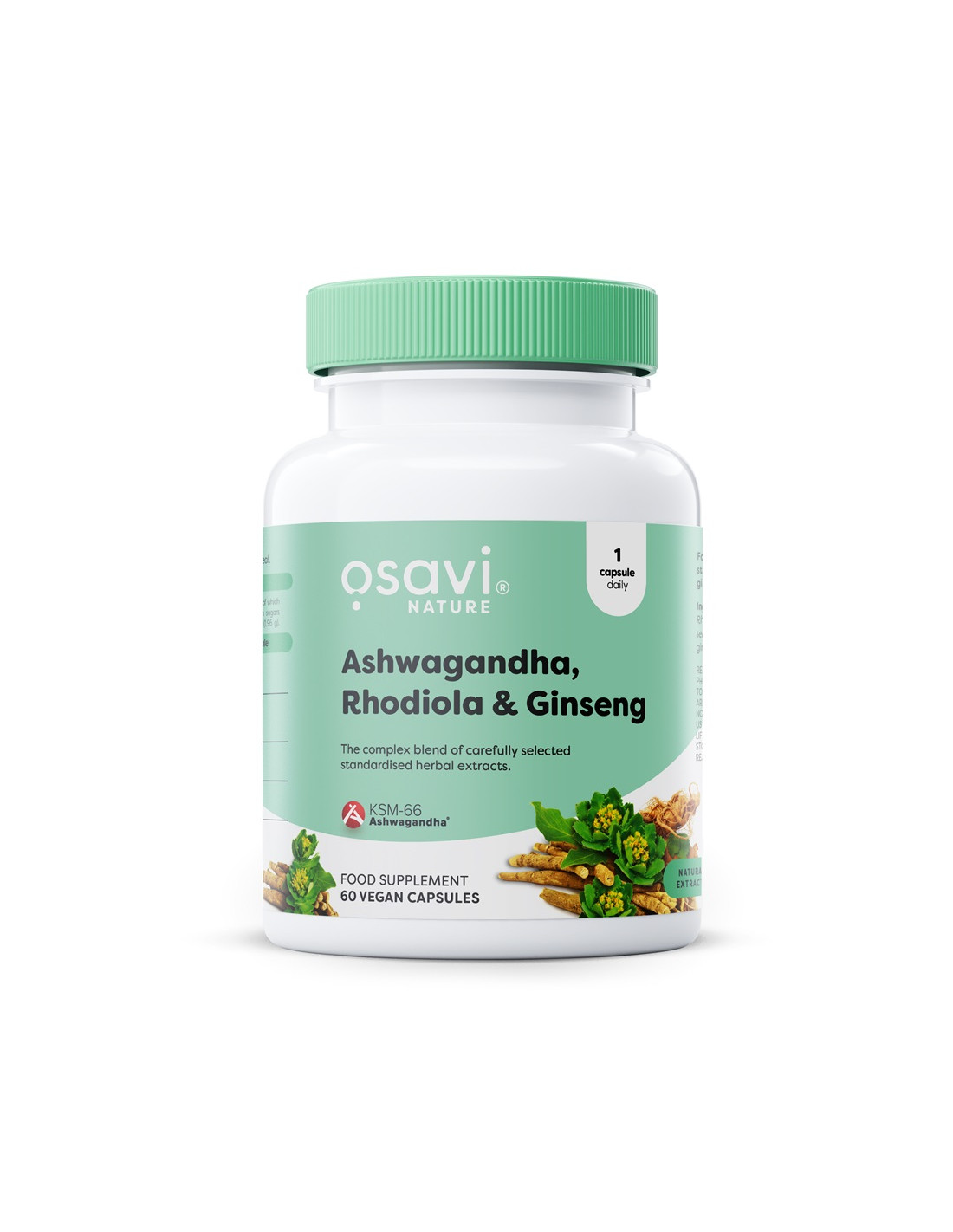 Osavi Ashwagandha + Rhodiola + Ginseng è una miscela premium di estratti vegetali adattogeni pensata per chi cerca un supporto naturale a base vegetale. Ogni capsula contiene ashwagandha KSM-66®, rhodiola rosea, ginseng siberiano e ginseng coreano clinicamente testati, ciascuno standardizzato per i suoi principali composti attivi come withanolidi, rosavine, salidrosidi, eleuterosidi e ginsenosidi. Vegano e privo di additivi artificiali.