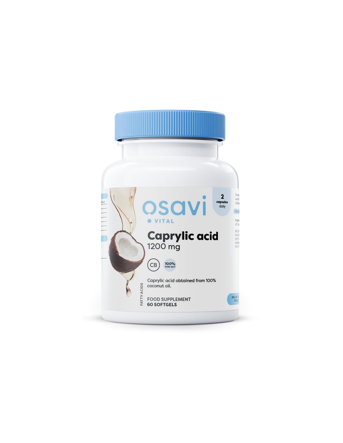L'acido caprilico Osavi è un integratore di alta qualità che fornisce trigliceridi a catena media (MCT) puri, ricavati da olio di cocco e di palmisti. Ogni dose da 2 capsule apporta 1333 mg di olio MCT, contenente 1200 mg di acido caprilico (C8:0). Gli MCT sono acidi grassi a rapido metabolizzazione, presentati qui in un pratico formato softgel per un facile utilizzo quotidiano. Verificato dall'etichetta ufficiale del prodotto Osavi.