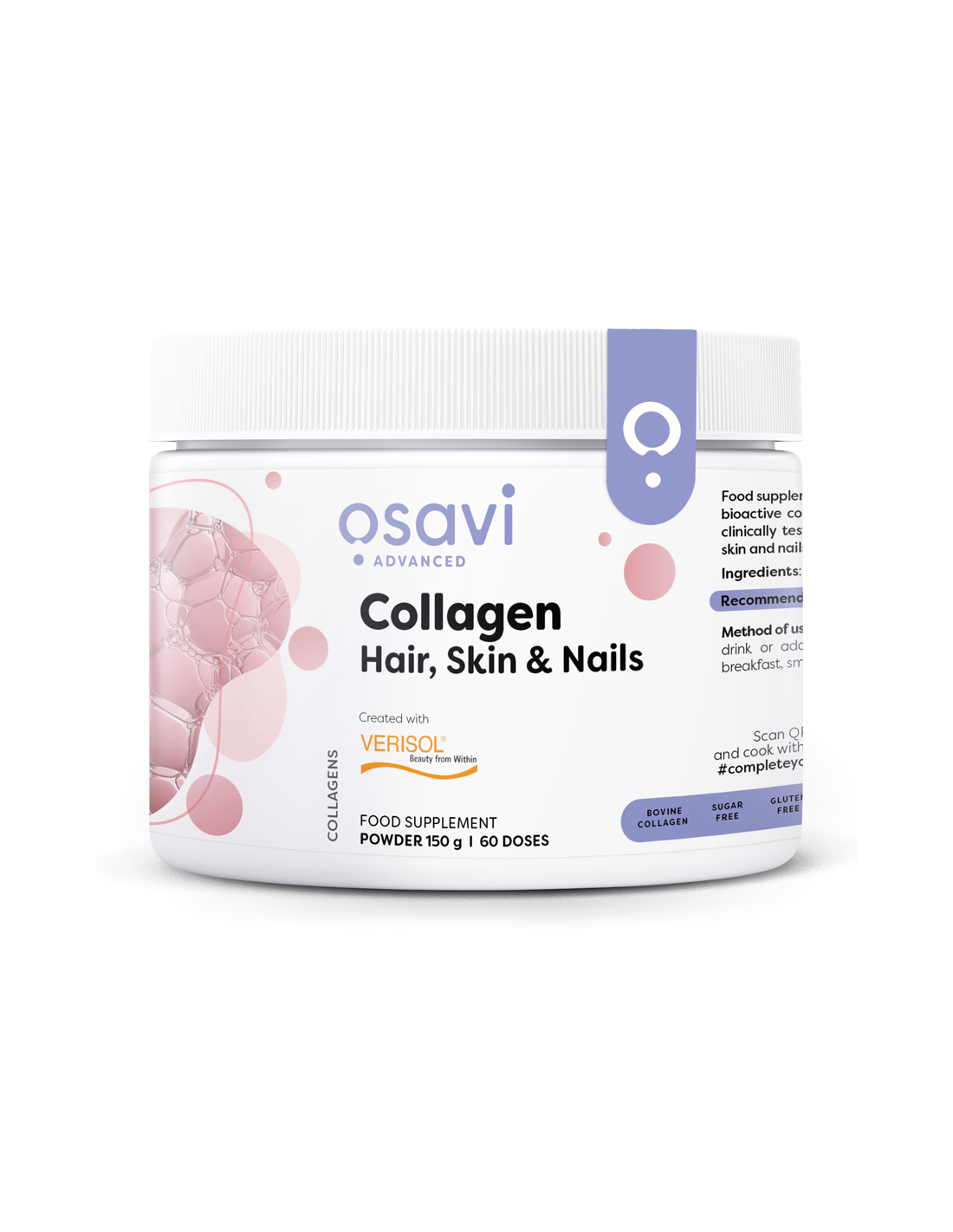 Osavi Collagen Hair, Skin & Nails contiene peptidi di collagene bioattivi VERISOL® clinicamente testati. Ogni porzione giornaliera apporta 2,5 g di proteine di collagene di alta qualità derivate da fonti bovine. La formula è insapore, facile da miscelare e non contiene zuccheri, grassi o conservanti aggiunti, il che la rende ideale per l'uso quotidiano nell'ambito di una dieta equilibrata.