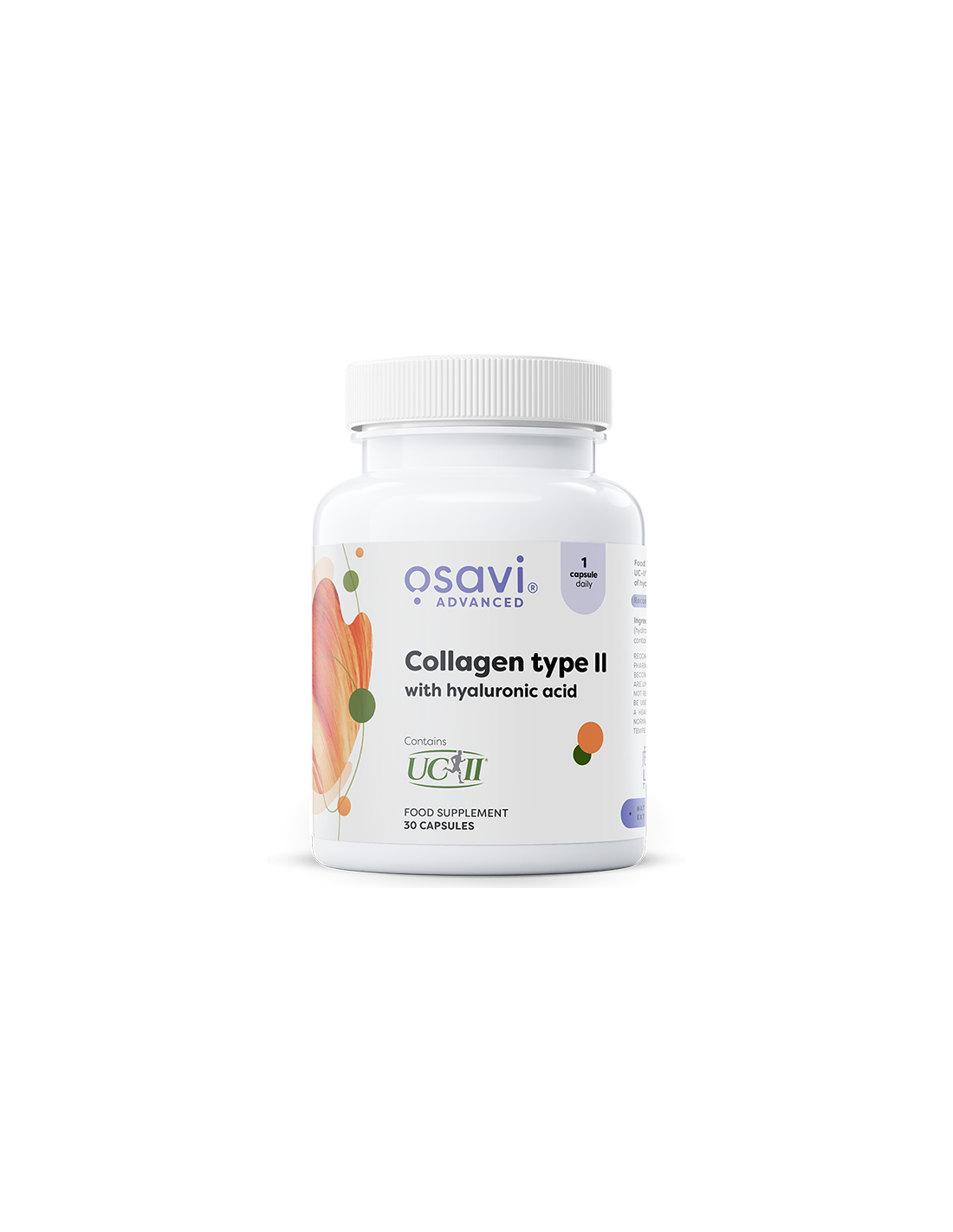 Osavi Collagen Type II con acido ialuronico fornisce una combinazione attentamente bilanciata di cartilagine di pollo standardizzata UC-II®, acido ialuronico ed estratto di rosa canina ( Rosa canina ) ricco di vitamina C. Ogni capsula fornisce 10 mg di collagene nativo di tipo II e 100 mg di acido ialuronico, insieme a 200 mg di vitamina C da estratto di rosa canina, contribuendo alla normale formazione di collagene per la normale funzione della cartilagine e delle ossa (come da EFSA 1924/2006).