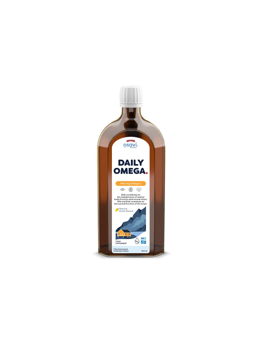 Osavi Daily Omega è un olio di pesce ad alta purezza dal fresco sapore di limone, che offre una dose concentrata di acidi grassi essenziali omega-3 (EPA e DHA). Ogni porzione da 5 ml apporta 4600 mg di olio di pesce, con un apporto totale di almeno 1600 mg di omega-3. Verificato secondo l'etichetta ufficiale del prodotto Osavi.