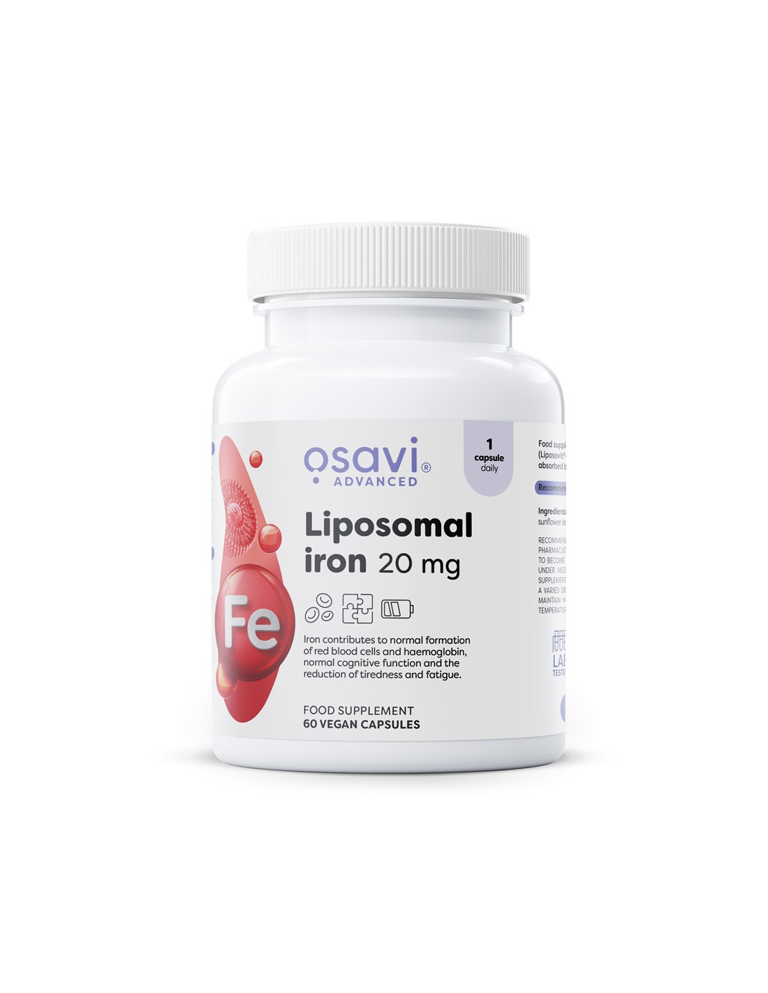 Osavi Liposomal Iron fornisce 20 mg di ferro per capsula in una forma liposomiale delicata e biodisponibile, Liposovit®-Fe (bisglicinato ferroso). Il ferro contribuisce al normale trasporto di ossigeno nell'organismo, alla formazione dei globuli rossi e aiuta a ridurre stanchezza e affaticamento (come riconosciuto dall'EFSA). Questa formula è progettata per un elevato assorbimento e una buona tollerabilità gastrointestinale.