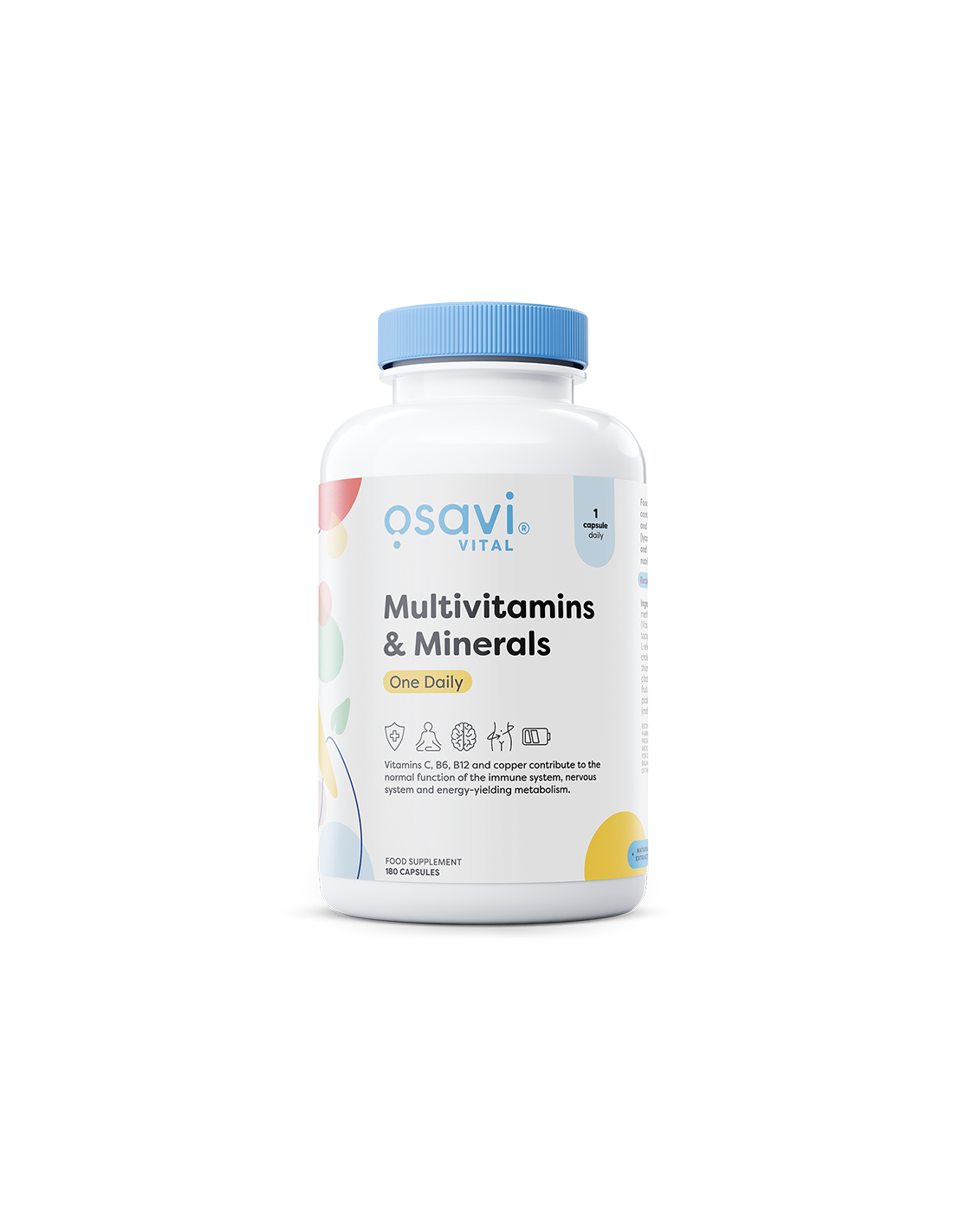 Osavi Multivitamin & Minerals One Daily è una miscela completa di 23 vitamine, minerali e fitonutrienti studiata per integrare una dieta equilibrata. Ogni capsula fornisce micronutrienti essenziali come vitamina A, D3, E, C e l'intero complesso B, insieme a oligoelementi come zinco, selenio e iodio. Arricchito con antiossidanti naturali – estratto di semi d'uva (95% PAC), luteina, zeaxantina e licopene – e BioPerine® per una migliore biodisponibilità dei nutrienti.