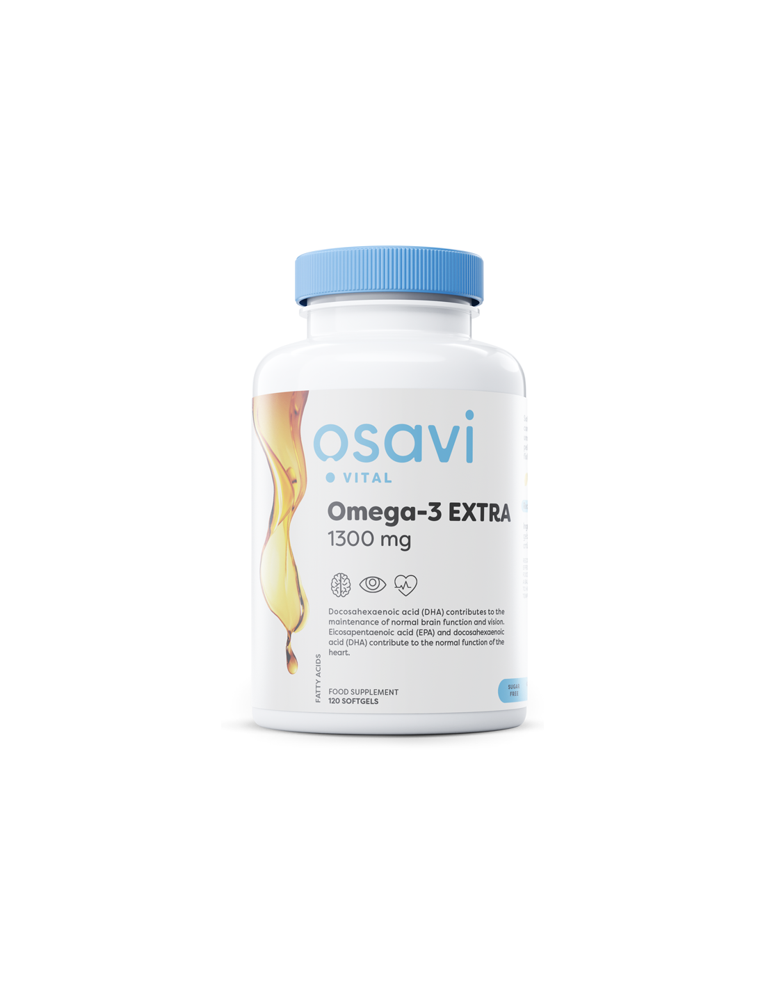 Osavi Omega-3 Extra è un integratore di olio di pesce ad alto dosaggio in forma di trigliceridi (TG 36/24), che offre una potente combinazione di acidi grassi omega-3. Ogni dose da 2 capsule fornisce 2000 mg di olio di pesce contenente 1300 mg di omega-3 totali, inclusi 720 mg di EPA e 480 mg di DHA, con un rinfrescante sapore di limone.