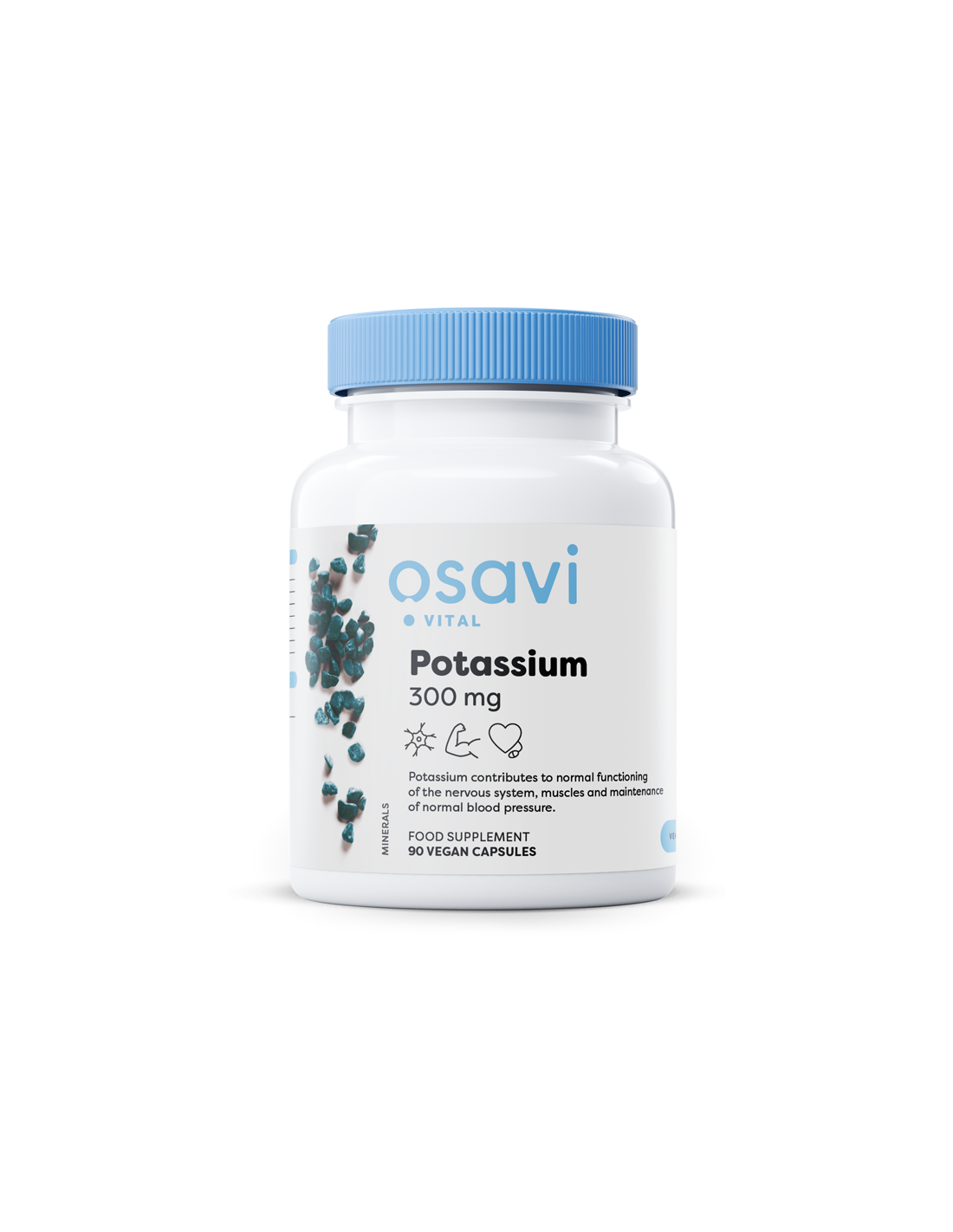 Osavi Potassium 300 mg fornisce potassio in forma di citrato altamente biodisponibile, apportando 300 mg di potassio (15% del VNR) per dose giornaliera di tre capsule. Questo integratore vegano offre un modo semplice per integrare l'assunzione giornaliera di potassio con una formulazione pulita e trasparente.