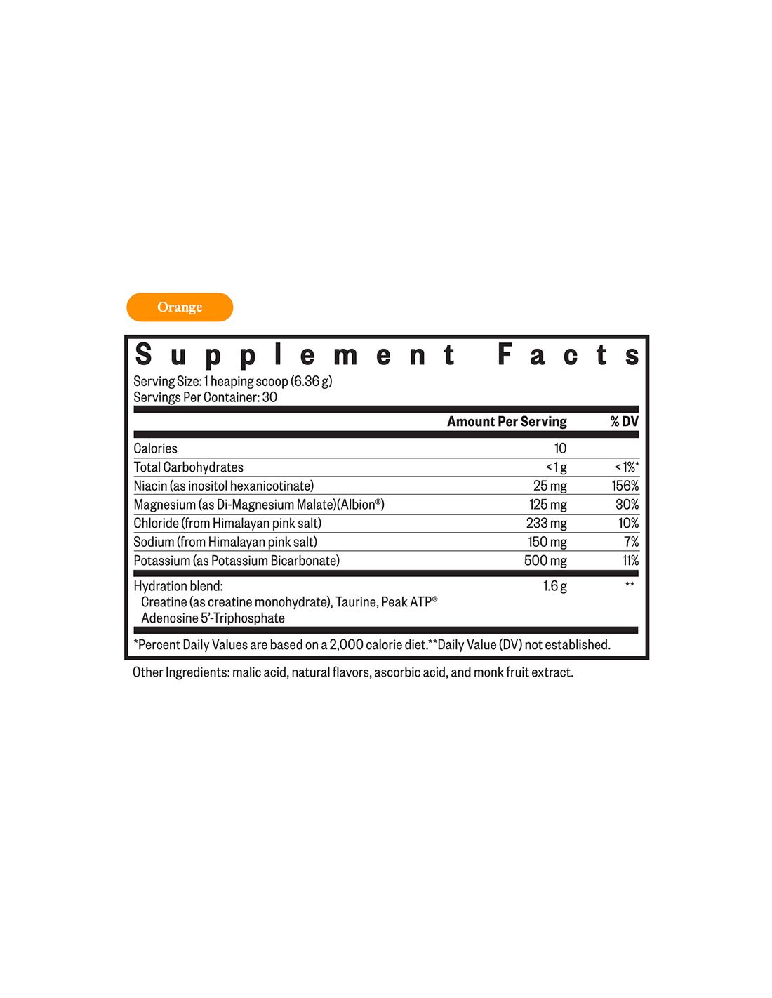 Magnesio (come malato di dimagnesio), Potassio (come bicarbonato di potassio), Cloruro e Sodio da sale rosa dell'Himalaya, Niacina (come inositolo esanicotinato), Creatina (come creatina monoidrato), Taurina, Peak ATP® (adenosina 5′-trifosfato), aroma naturale di arancia, estratto di frutto del monaco, acido malico. Senza glutine, latticini, soia, coloranti artificiali, dolcificanti artificiali e conservanti. :contentReference[oaicite:5]{index=5}