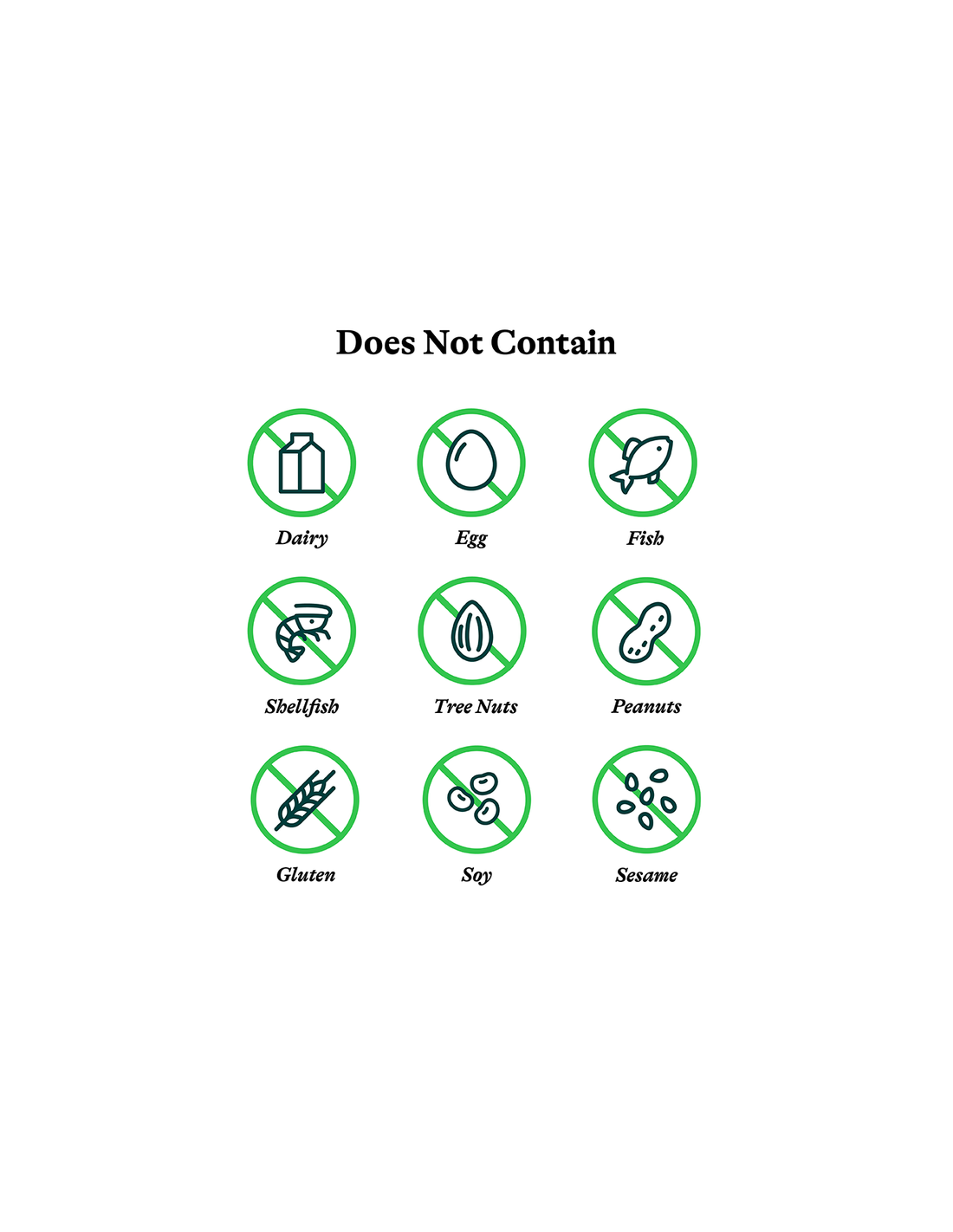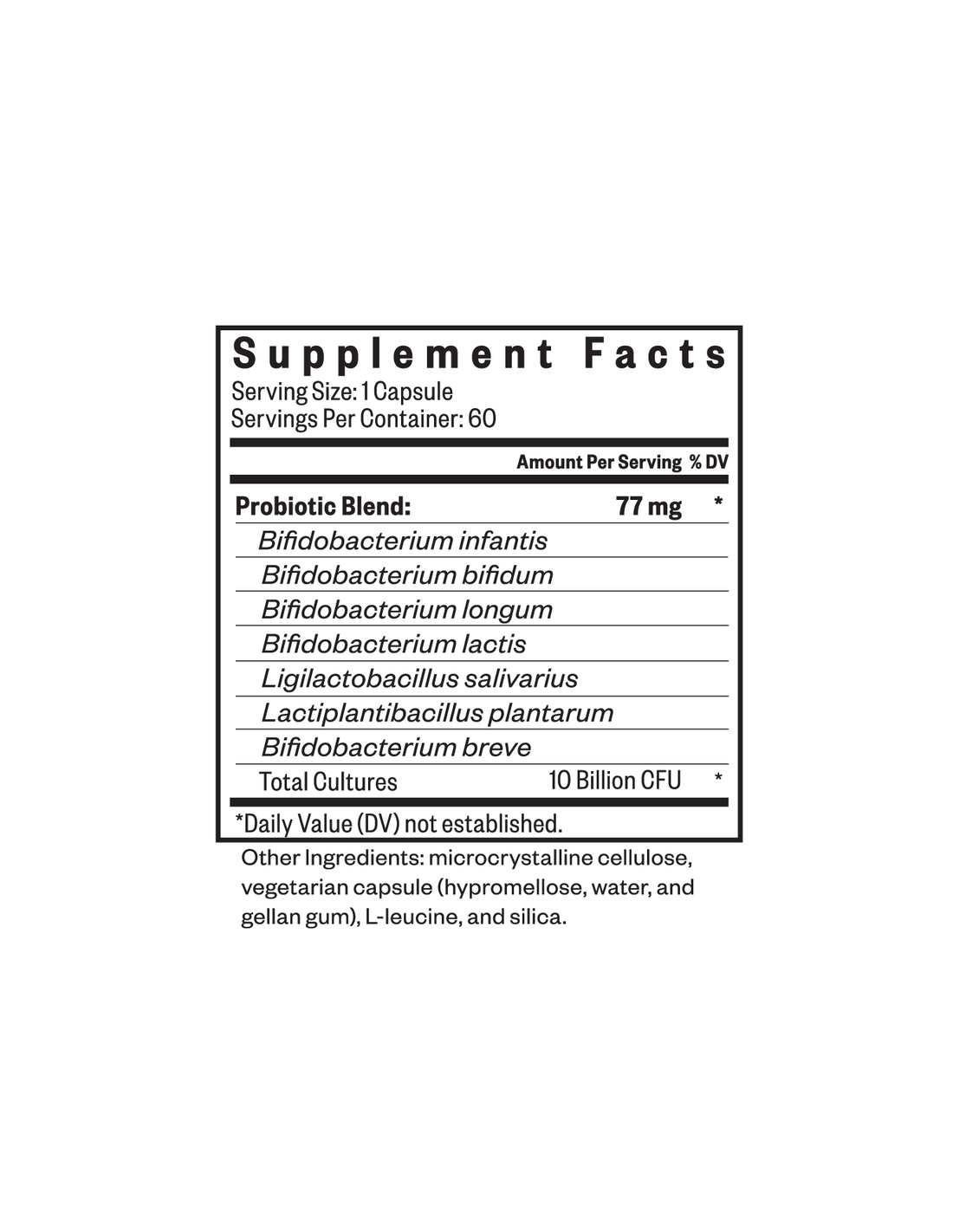 Senza glutine, latticini, soia, uova, pesce, crostacei, arachidi, frutta a guscio, sesamo, OGM, coloranti o aromi artificiali. La capsula resistente agli acidi garantisce l'assorbimento dei probiotici nell'intestino. Non contiene ceppi che producono istamina.