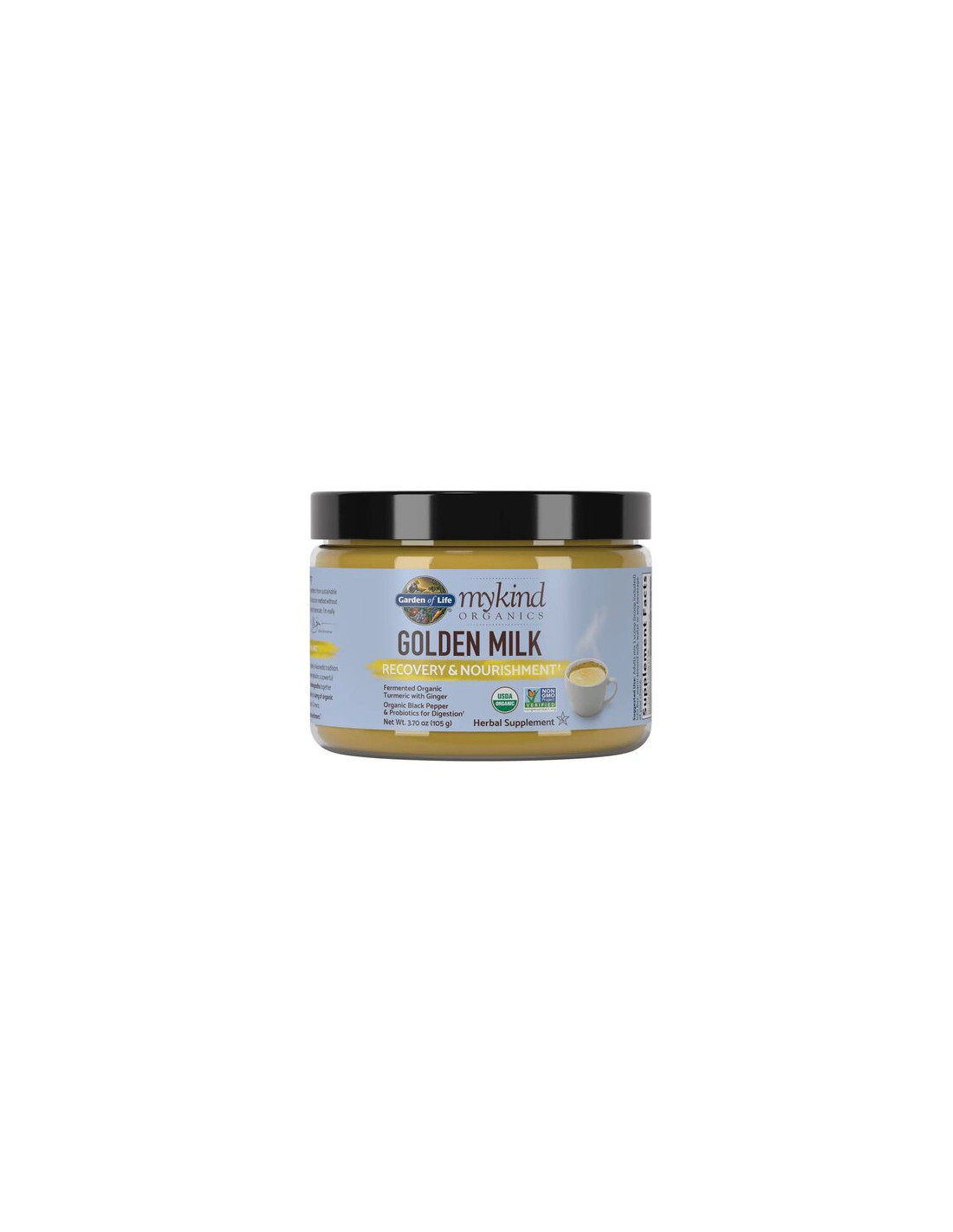 Garden of Life Organics Golden Milk Powder is een voedingssupplement samengesteld met een biologische mix van gouden melk, kurkumawortel, kurkumawortelextract gestandaardiseerd op curcuminoïden, gefermenteerde kurkumawortel en geselecteerde plantaardige ingrediënten. De formule bevat ook een probiotische mix en is verkrijgbaar in poedervorm om te mengen met warme dranken.