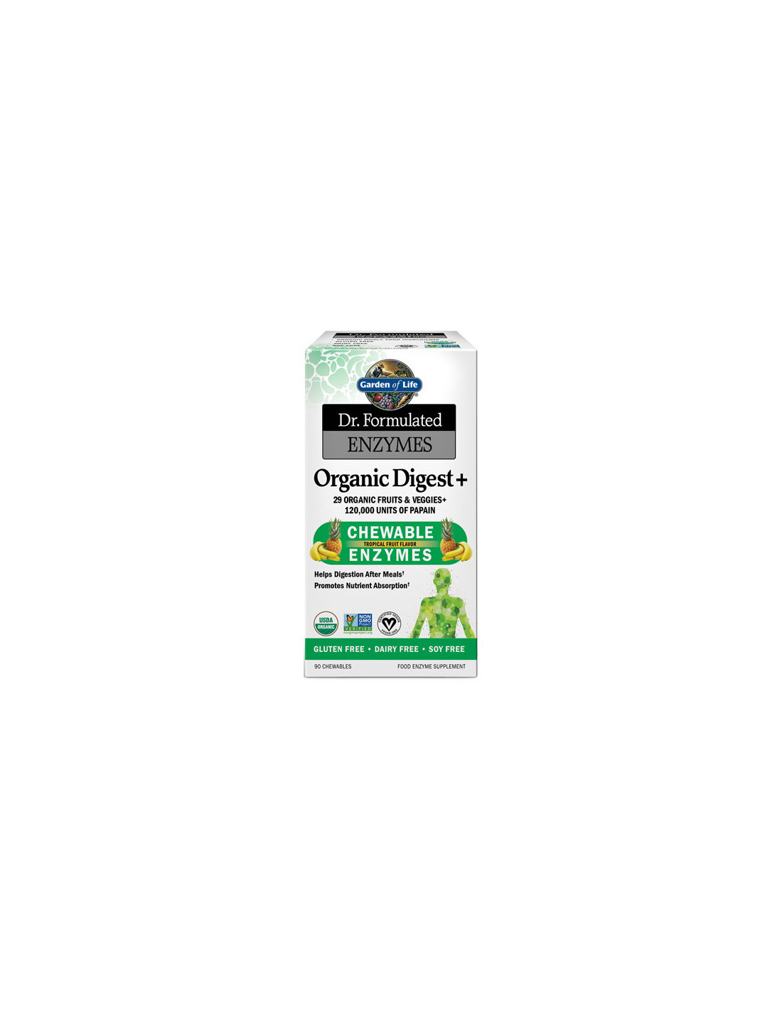 Dr. Formulated Enzymes Organic Digest Chewables van Garden of Life zijn kauwtabletten als voedingssupplement, samengesteld met een mix van natuurlijke enzymen en biologische plantaardige ingrediënten. De kauwtabletten met tropische fruitsmaak zijn ontworpen voor gemakkelijk gebruik na de maaltijd of als tussendoortje.