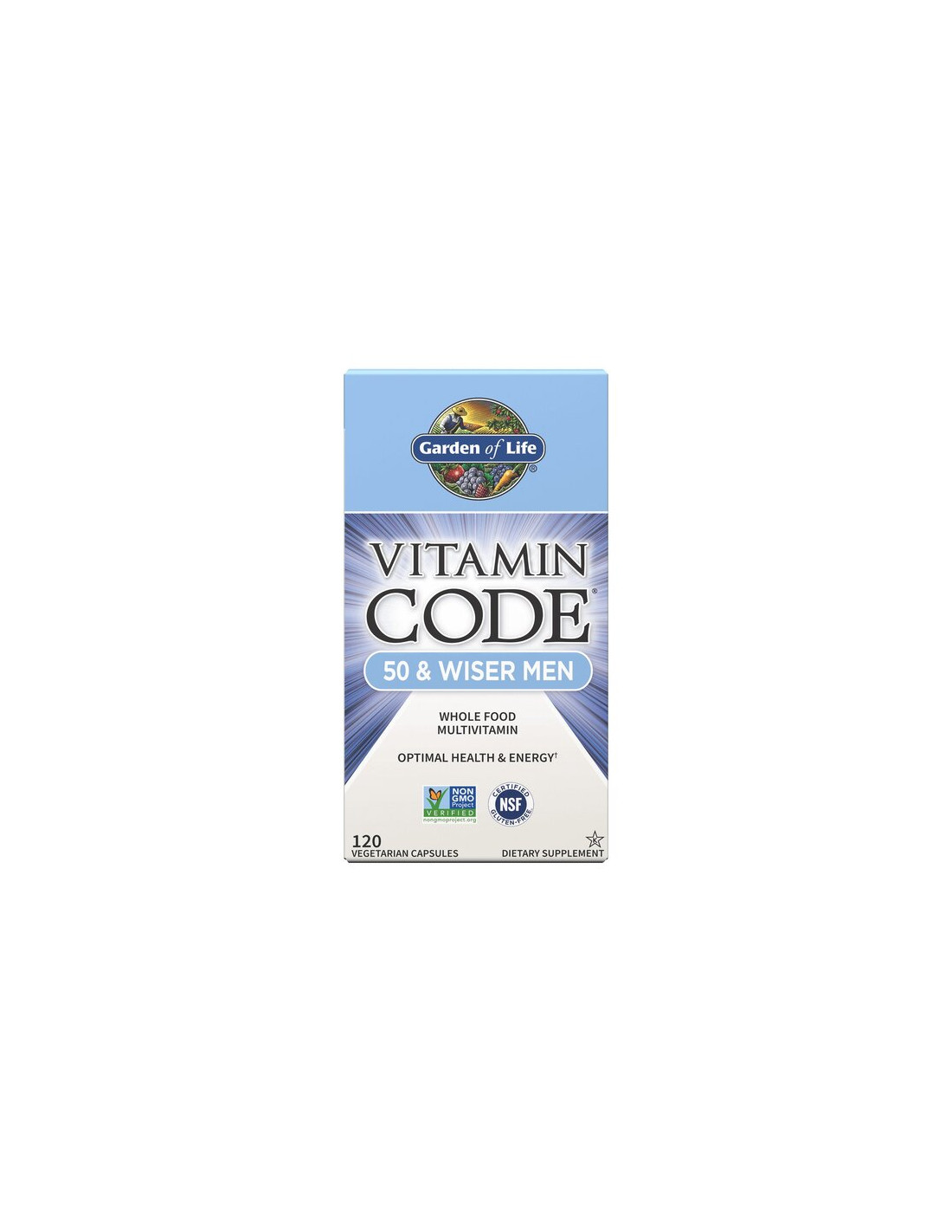 Garden of Life Vitamin Code 50 & Wiser Men is een voedingssupplement samengesteld met een uitgebreide combinatie van vitaminen en mineralen, aangevuld met biologische fruit- en groentemengsels, enzymen en probiotische culturen. De capsules zijn ontworpen voor gemakkelijke dagelijkse inname.