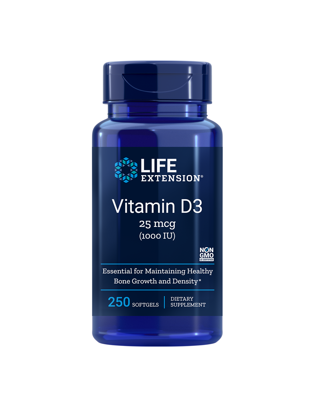 Vitamine D3 25 µg (1000 IE), 250 softgels, levert een dagelijkse softgel met 25 µg (1000 IE) vitamine D3 (cholecalciferol), een belangrijke voedingsstof voor gezonde botten, immuunfunctie, celdifferentiatie en een gezonde cardiovasculaire en endotheelactiviteit. Glutenvrije, niet-GMO-formule in een softgel met olijfolie voor optimale absorptie. ([lifeextensioneurope.com](https://www.lifeextensioneurope.com/vitamin-d3-250-softgels-eu))