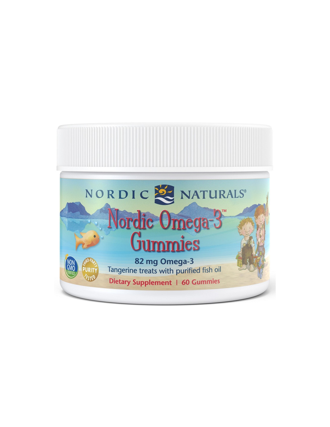 Nordic Naturals Nordic Omega-3 Gummies bieden kinderen een leuke en gemakkelijke manier om hun dagelijkse omega-3-inname binnen te krijgen. Elke portie van 2 gummies bevat 82 mg totale omega-3, inclusief 68 mg EPA en DHA samen, afkomstig van gezuiverde visolie in natuurlijke triglyceridevorm (rTG). Geformuleerd voor zuiverheid, veiligheid en een heerlijke smaak met natuurlijke aroma's en kleuren.