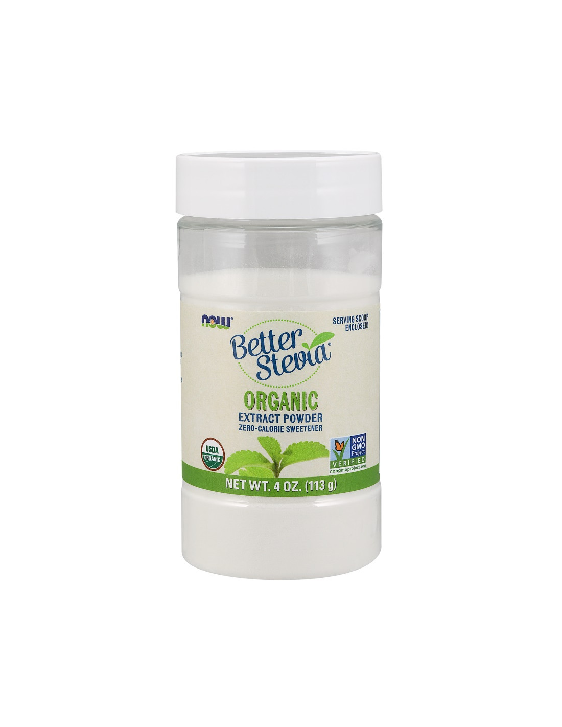 NOW® BetterStevia® Biologisch Extract Poeder is een zeer geconcentreerde tafelzoetstof, afkomstig van biologisch steviablad. Dit veganistische en glutenvrije poeder bevat nul calorieën en is gecertificeerd biologisch. Het is geschikt voor het zoeten van dranken, recepten en alledaagse gerechten.