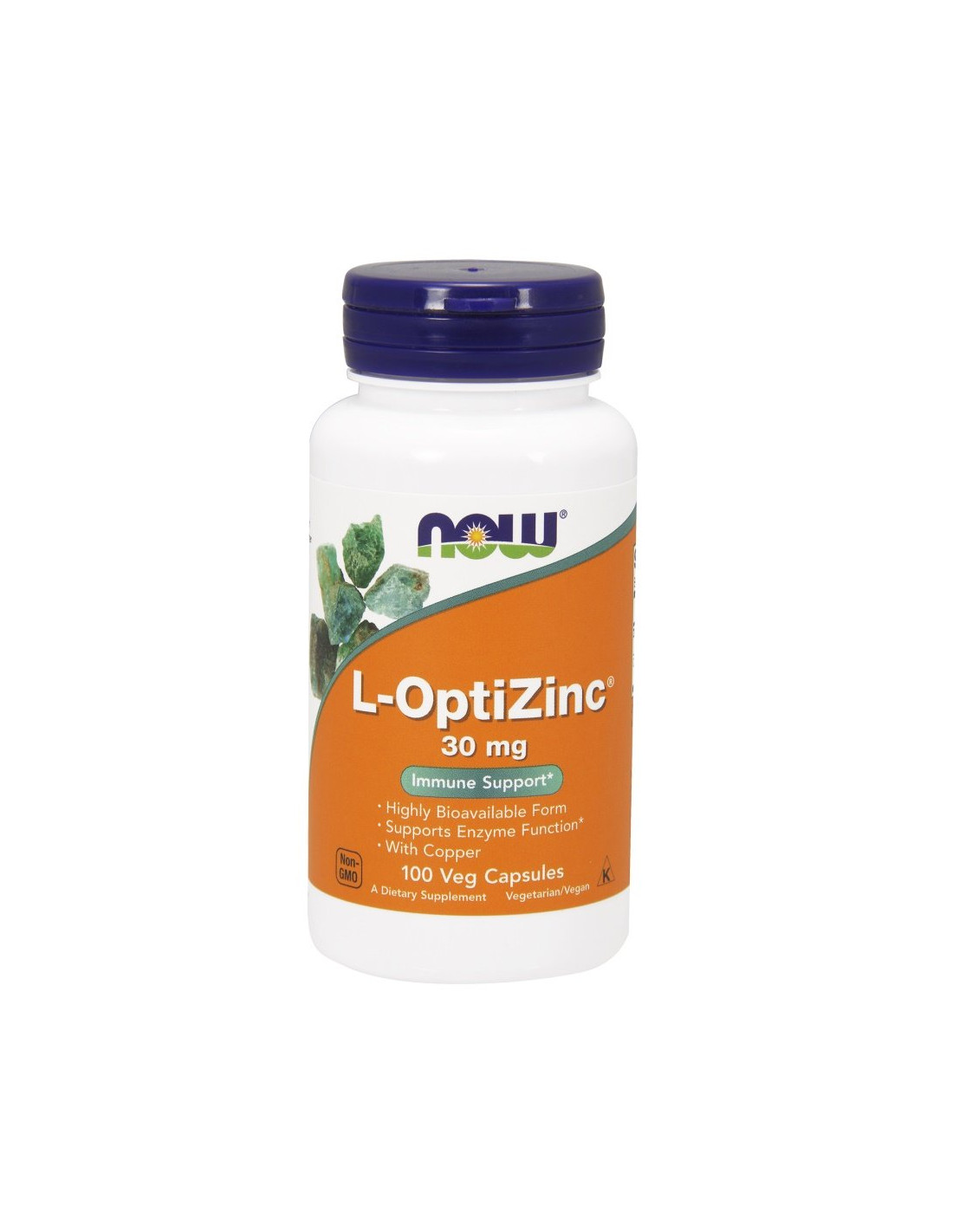 NOW® L-OptiZinc® bevat zinkmonomethionine met toegevoegd koper in plantaardige capsules. Elke portie bevat 30 mg elementair zink en 0,3 mg elementair koper, ontworpen voor gemakkelijk dagelijks gebruik.