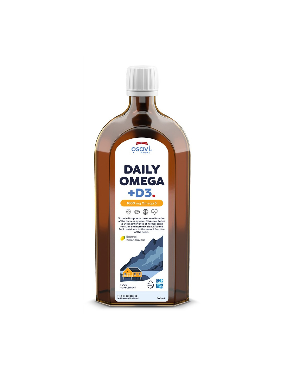 Premium visoliesupplement verrijkt met vitamine D3 en natuurlijke citroensmaak. Elke portie van 5 ml bevat 4600 mg visolie, inclusief minimaal 1600 mg totale omega-3-vetzuren (EPA, DHA en andere omega-3-vetzuren) en 50 µg (2000 IE) vitamine D3 (cholecalciferol). Samenstelling geverifieerd volgens het officiële Osavi-label.